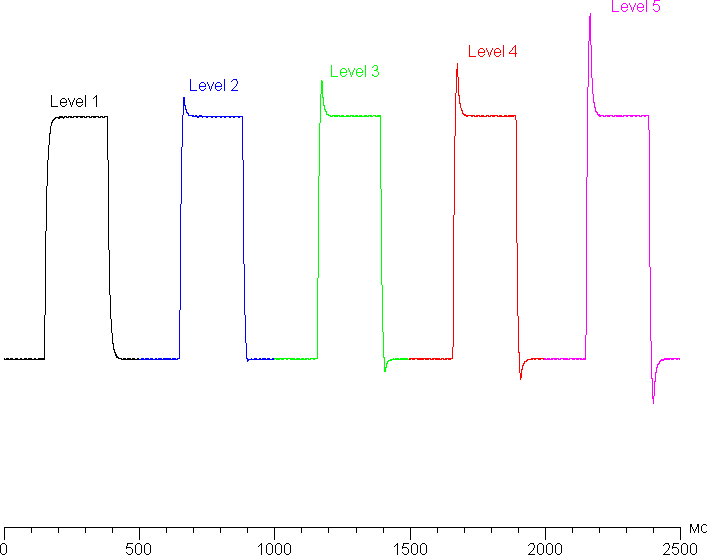 Ниже приведены графики полутонового перехода между оттенками 40% и 60% и обратно при различных значениях настройки Response Time (по вертикали — яркость, по горизонтали — время, для наглядности графики выстроены последовательно):
