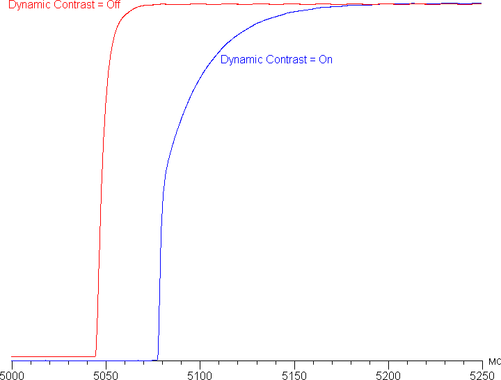 При включении режима Dynamic Contrast при выводе черного поля на весь экран яркость подсветки сразу снижается, а где-то через 4,5 с выключается совсем. При переключении на вывод белого поля яркость возрастает до установленного пользователем максимума почти моментально. График ниже показывает, как увеличивается яркость (вертикальная ось) при переключении с черного поля (после пяти секунд вывода) на белое при выключенной и включенной динамической подстройке яркости: