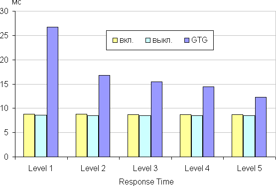 Время отклика зависит от значения настройки Response Time, которая управляет разгоном матрицы. Ступеней регулировки пять. Диаграмма ниже показывает, как меняется время включения и выключения при переходе черный-белый-черный (столбики «вкл.» и «выкл.»), а также среднее суммарное время для переходов между полутонами (столбики GTG):