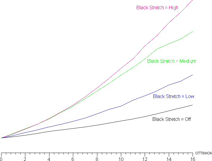 Уровень черного при этом не меняется, но где-то до 100-го оттенка серого яркость оттенков серого увеличивается в сравнении с вариантом Black Stretch = Off.