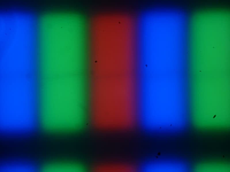 Из-за матовой поверхности экрана четкого изображения пикселей получить не удалось (черные точки — это пыль на матрице фотоаппарата), однако характерная для IPS структура субпикселей просматривается: