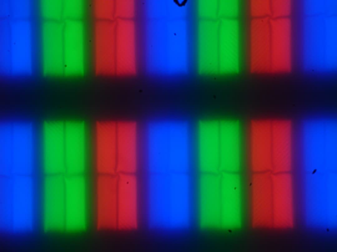 Четкое изображение структуры пикселей из-за матовой поверхности получить не удается, впрочем, на фрагменте ниже можно разглядеть типичную для VA структуру в виде параллельных полосок, а также что каждый субпиксель делится на четыре равных домена, в которых полоски ориентированы под разными углами (черные точки — это пыль на матрице фотоаппарата):