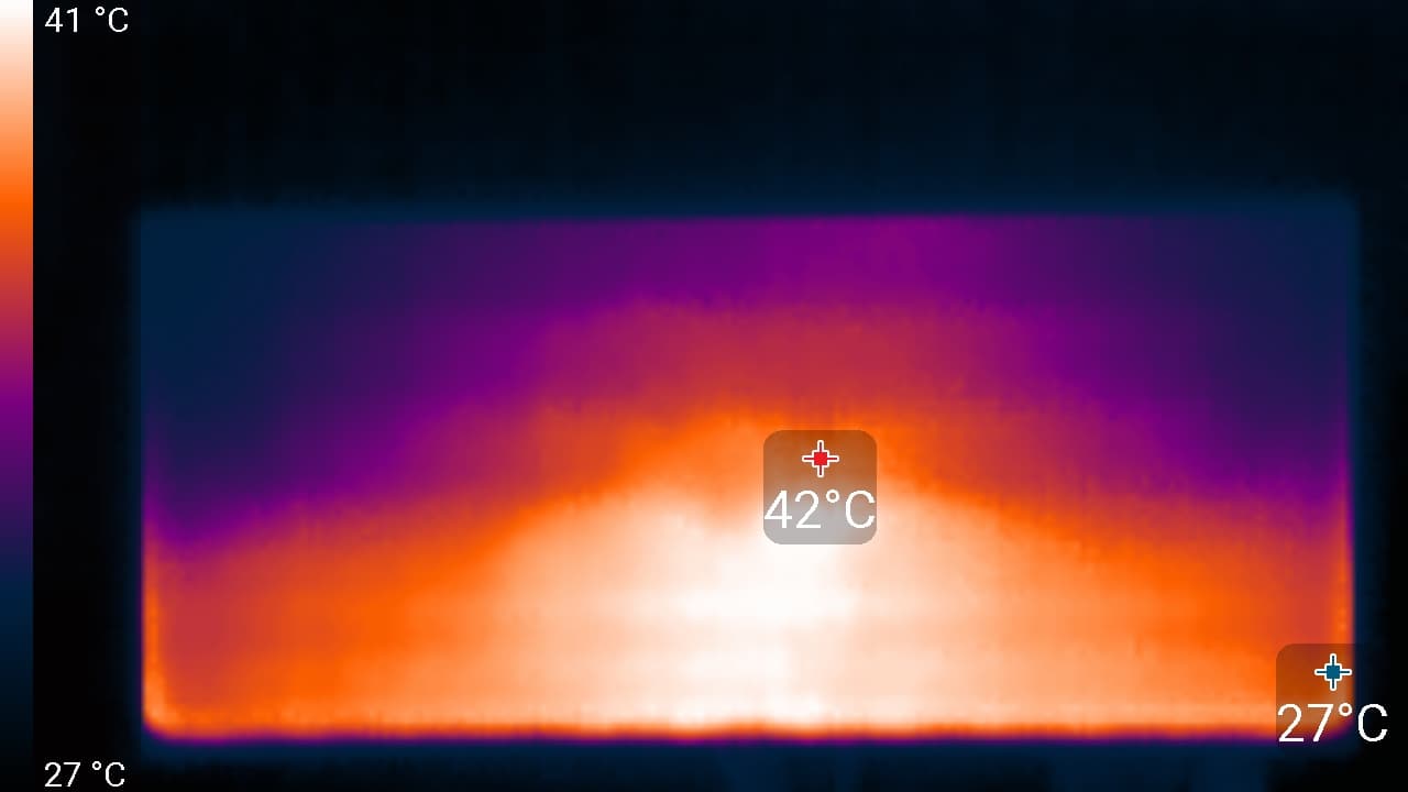 По распределению областей нагрева, можно предположить, что внизу находится светодиодная линейка подсветки экрана. Нагрев сзади умеренный. Корпус БП нагрелся до 55 °C, что весьма много: