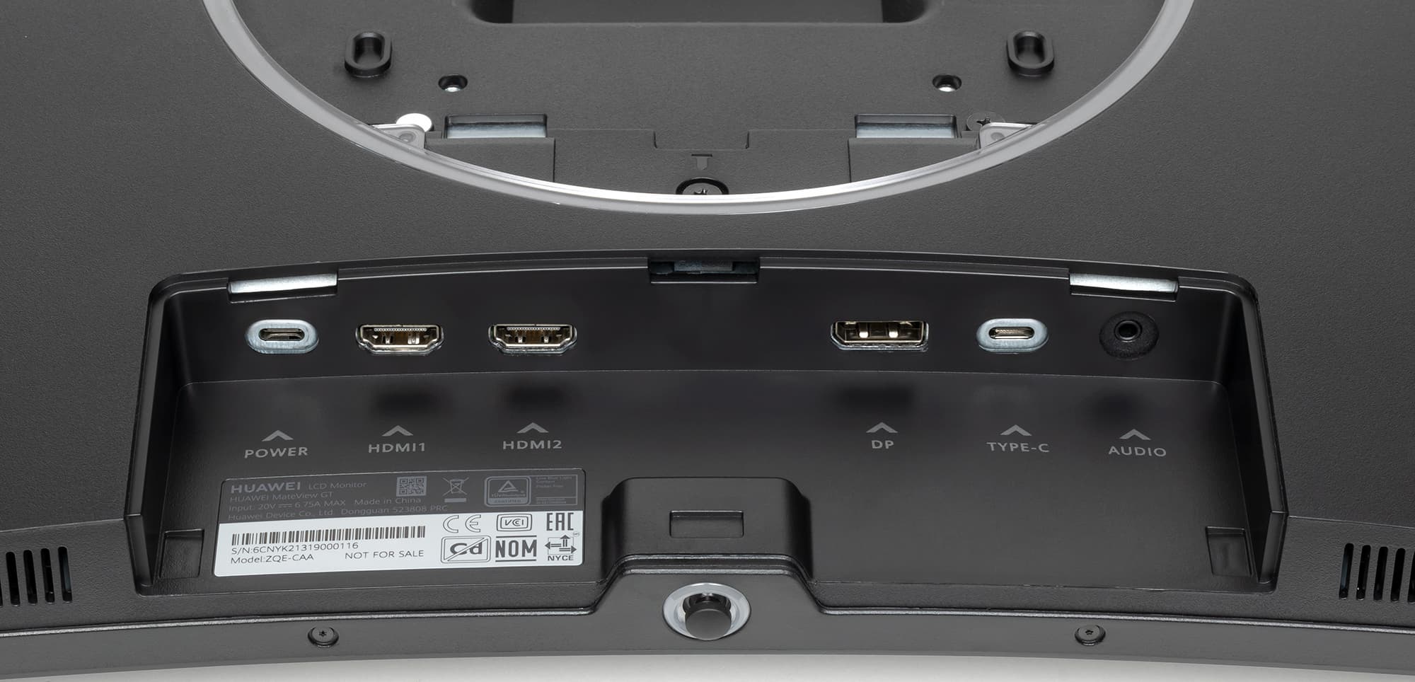 Все интерфейсные разъемы и разъем питания расположены в незамкнутой нише на задней панели и ориентированы вниз. Подключать кабели к этим разъемам неудобно. Нишу с разъемами можно закрыть декоративным щитком — так сзади монитор выглядит аккуратнее. Вокруг круглой крепежной площадки есть кольцевая вставка из прозрачного пластика, которая вопреки ожиданиям не подсвечивается.