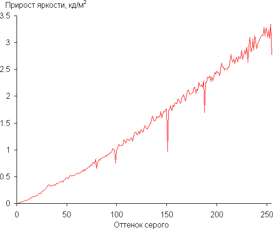 Для оценки характера роста яркости на шкале серого мы измерили яркость 256 оттенков серого (от 0, 0, 0 до 255, 255, 255). График ниже показывает прирост (не абсолютное значение!) яркости между соседними полутонами: