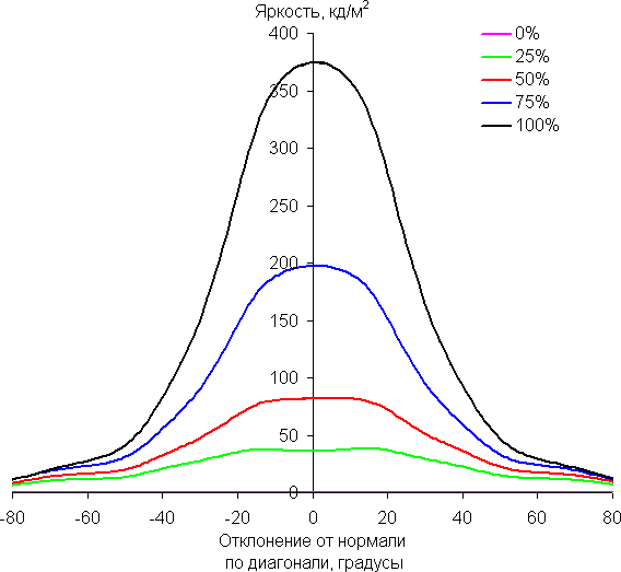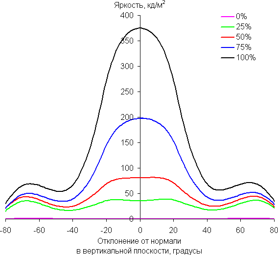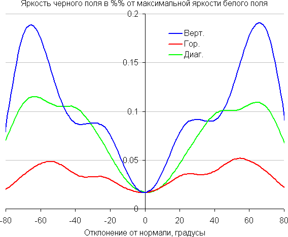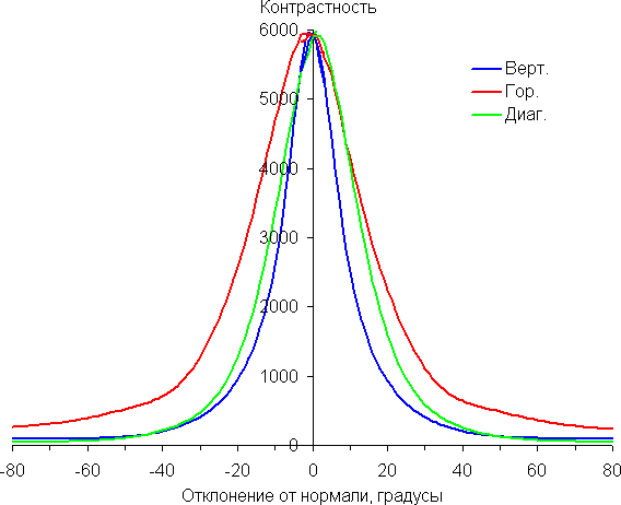 По скорости падения яркости углы обзора неширокие. Отметим примерно одинаковый характер уменьшения яркости при отклонении от перпендикуляра к экрану во всех трех направлениях, при этом графики не пересекаются во всем диапазоне измеряемых углов. При отклонении в вертикальном направлении яркость черного поля достигает большего значения, чем в двух других случаях. Однако максимум яркости черного поля все равно гораздо меньше, чем в случае типичного монитора на матрице IPS. Контрастность в диапазоне углов ±82° остается существенно выше значения 10:1.