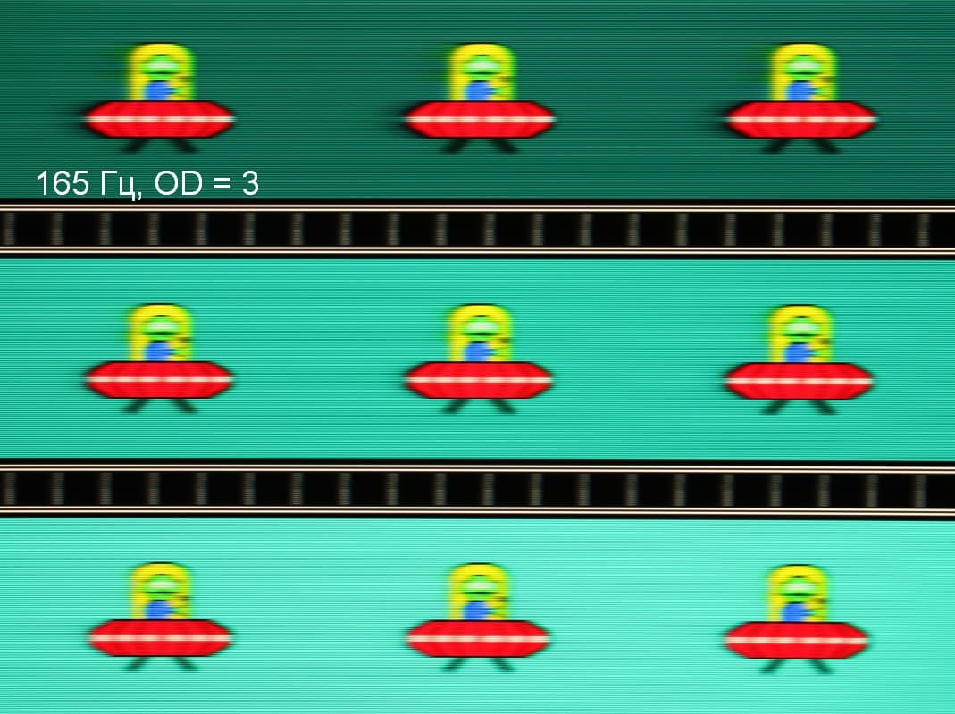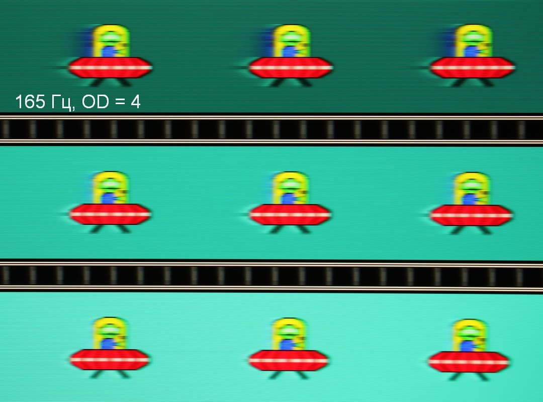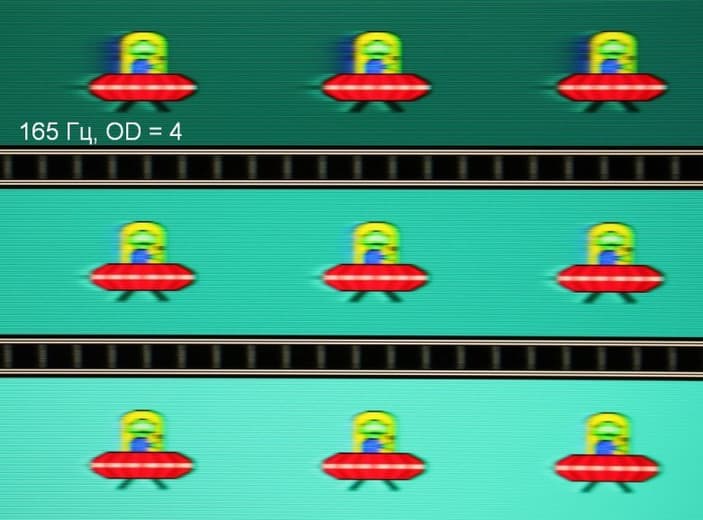 Видно, что при прочих равных условиях четкость изображения повышается по мере роста частоты обновления и степени разгона, но на максимальном разгоне артефакты уже очень заметные. Такое ощущение, что не хватает промежуточной компромиссной ступени разгона между предпоследней и последней.
