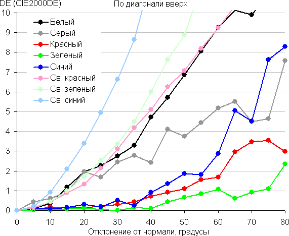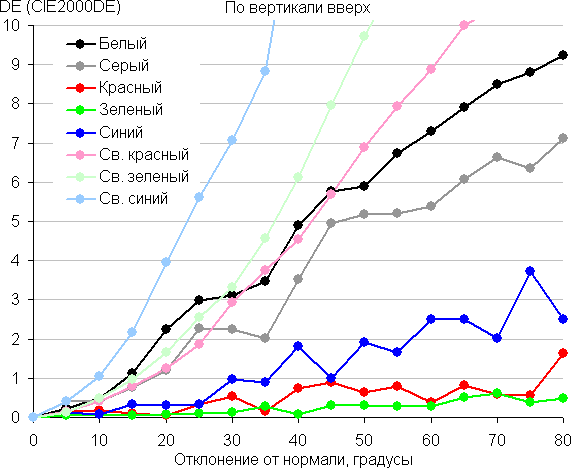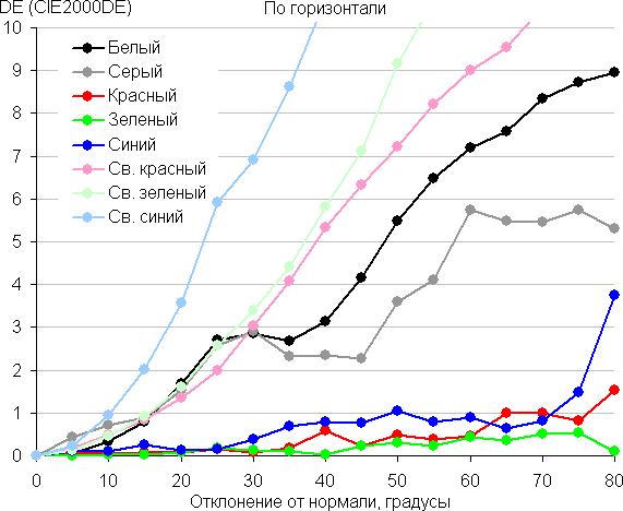 Для количественной характеристики изменения цветопередачи мы провели колориметрические измерения для белого, серого (127, 127, 127), красного, зеленого и синего, а также светло-красного, светло-зеленого и светло-синего полей во весь экран с использованием установки, подобной той, что применялась в предыдущем тесте. Измерения проводились в диапазоне углов от 0° (датчик направлен перпендикулярно к экрану) до 80° с шагом в 5°. Полученные значения интенсивностей были пересчитаны в ΔE относительно замера каждого поля при перпендикулярном положении датчика относительно экрана. Результаты представлены ниже: