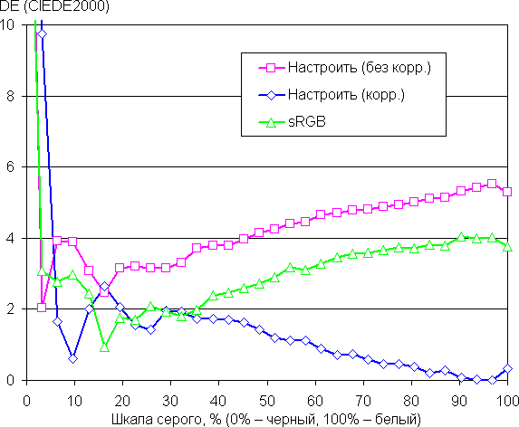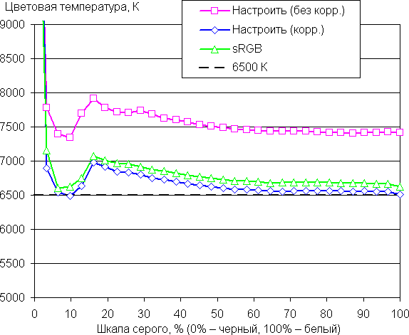 Самый близкий к черному диапазон можно не учитывать, так как в нем цветопередача не так важна, а погрешность измерения цветовых характеристик высокая. Ручная коррекция приблизила цветовую температуру к 6500 К, а заодно и уменьшила значение ΔE. Впрочем, для игрового применения особой необходимости в коррекции нет, а для получения правильных цветов и приемлемого цветового баланса достаточно выбрать профиль sRGB.