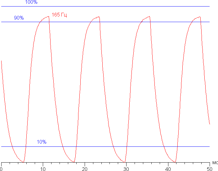 Приведем зависимости яркости (вертикальная ось) от времени (горизонтальная ось) при чередовании белого и черного кадра при 165 Гц кадровой частоты (первая ступень разгона, хотя на других все так же):