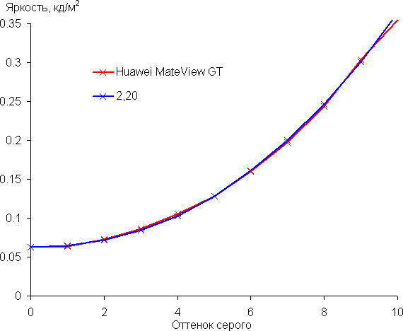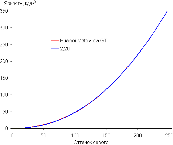 Аппроксимация полученной гамма-кривой дала показатель 2,20, что равно стандартному значению 2,2. При этом аппроксимирующая степенная функция мало отклоняется от реальной гамма-кривой: