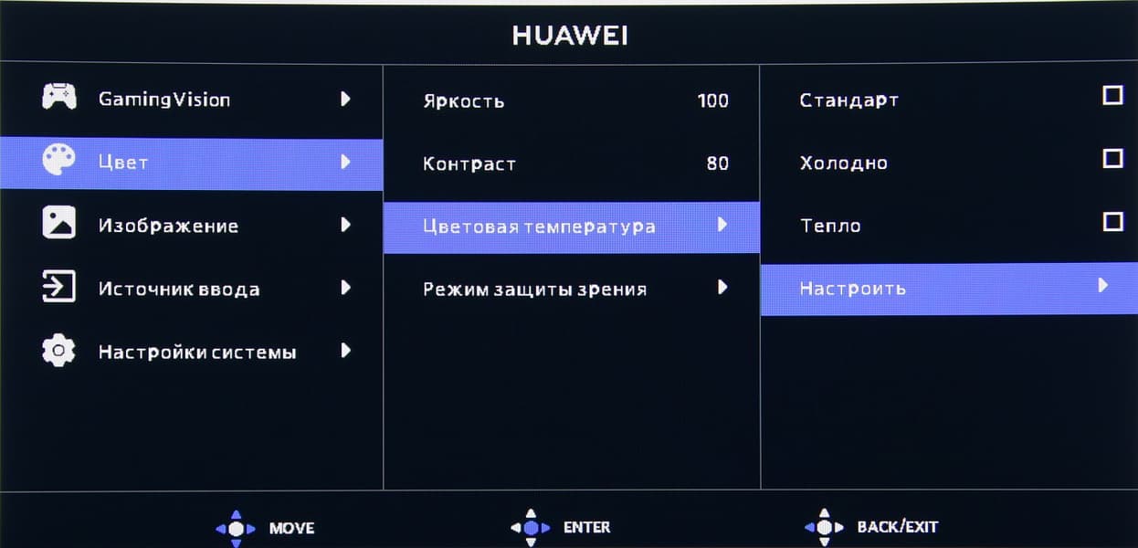 К сожалению, после выбора профиля sRGB, часть настроек, в частности настройки цветового баланса, становятся не доступными. Это типичная ошибка многих производителей мониторов. Отметим, что на экранах с широким цветовым охватом без соответствующей коррекции цвета обычных изображений, оптимизированных для устройств sRGB, выглядят неестественно насыщенными. Впрочем, как правило, в развитых OS, в Windows в частности, и/или в более-менее продвинутом ПО для работы с изображениями нужная коррекция цвета достигается при использовании системы управления цветом. Поэтому широкий цветовой охват недостатком в данном случае не является. Некоторые трудности с получением правильных цветов могут возникнуть в играх и при просмотре кино, но и это, при желании, решаемо. В случае источников типа бытового плеера или приставки для получения правильных цветов придется выбирать встроенный профиль sRGB, но и это не страшно, так как цветовой баланс для этого профиля неплох и без корректировки — см. ниже.