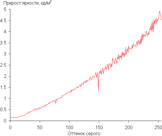Рост прироста яркости достаточно равномерный, и каждый следующий оттенок ярче предыдущего, а в самой темной области даже наблюдается близкий к линейному рост яркости, что отвечает требованиям стандарта sRGB: