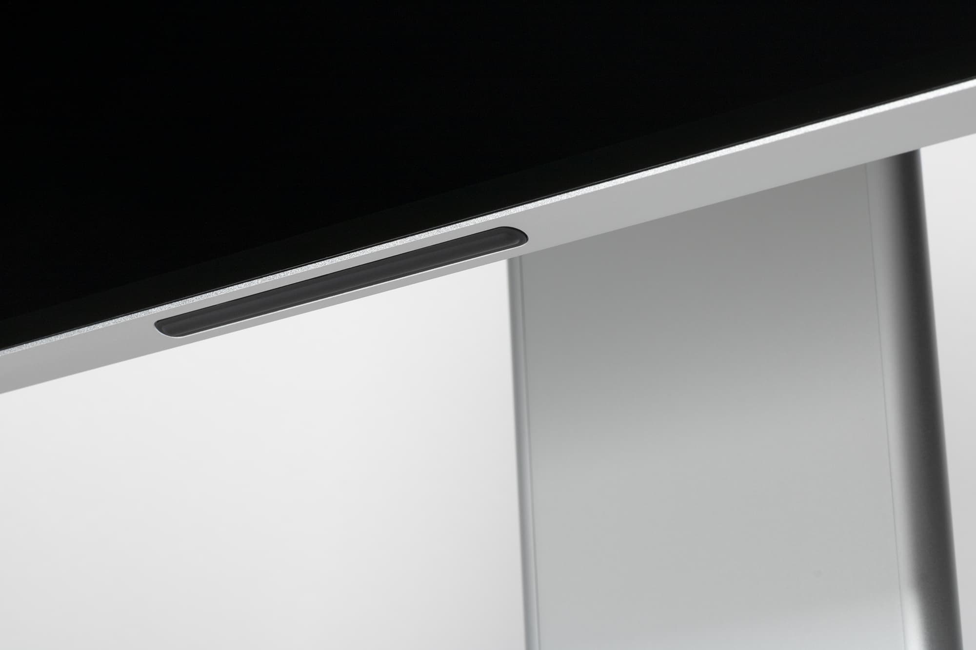 Дизайн монитора стильный, аккуратный и во многом уникальный. Цвет устройства производитель характеризует как «мистический серебристый». Стойка подставки и окантовка блока экрана изготовлены из алюминия с матовой анодированной поверхностью. Кожух сверху на основании подставки и задняя панель блока экрана выполнены из пластика также с матовой серебристой поверхностью. Шарнир, к которому крепится блок экрана, и круглая площадка изготовлены из нержавеющей стали с зеркально-гладкой полированной поверхностью. Низ основания стойки — из черного пластика с матовой поверхностью. Внешняя поверхность матрицы черная, полуматовая. Экран выглядит как монолитная поверхность, ограниченная по периметру узкой окантовкой. Выведя изображение, можно увидеть, что между внешними границами блока экрана и собственно областью отображения есть неширокие поля. Производитель указывает, что от области отображения до внешних краев блока экрана сверху и с боков по 6 мм, что является правдой, а полезная площадь экрана составляет 94%. При этом снизу поле чуть шире — 9,5 мм.