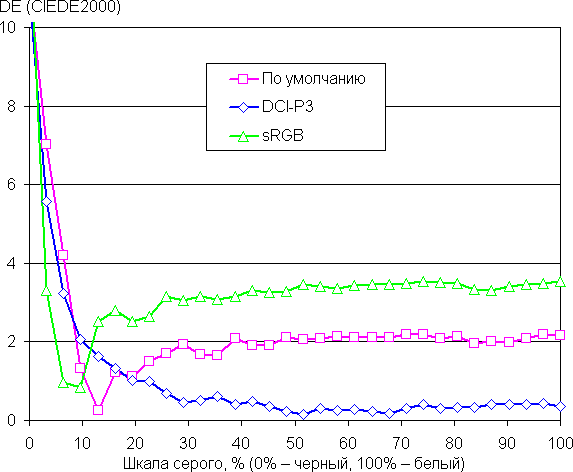 Самый близкий к черному диапазон можно не учитывать, так как в нем цветопередача не так важна, а погрешность измерения цветовых характеристик высокая. В принципе, в большинстве случаев и даже для ответственной работы с графикой будет достаточно выбрать профиль sRGB или DCI-P3. Как вариант также можно оставить профиль По умолчанию и использовать систему управления цветом, предварительно охарактеризовав монитор, создав его цветовой профиль.