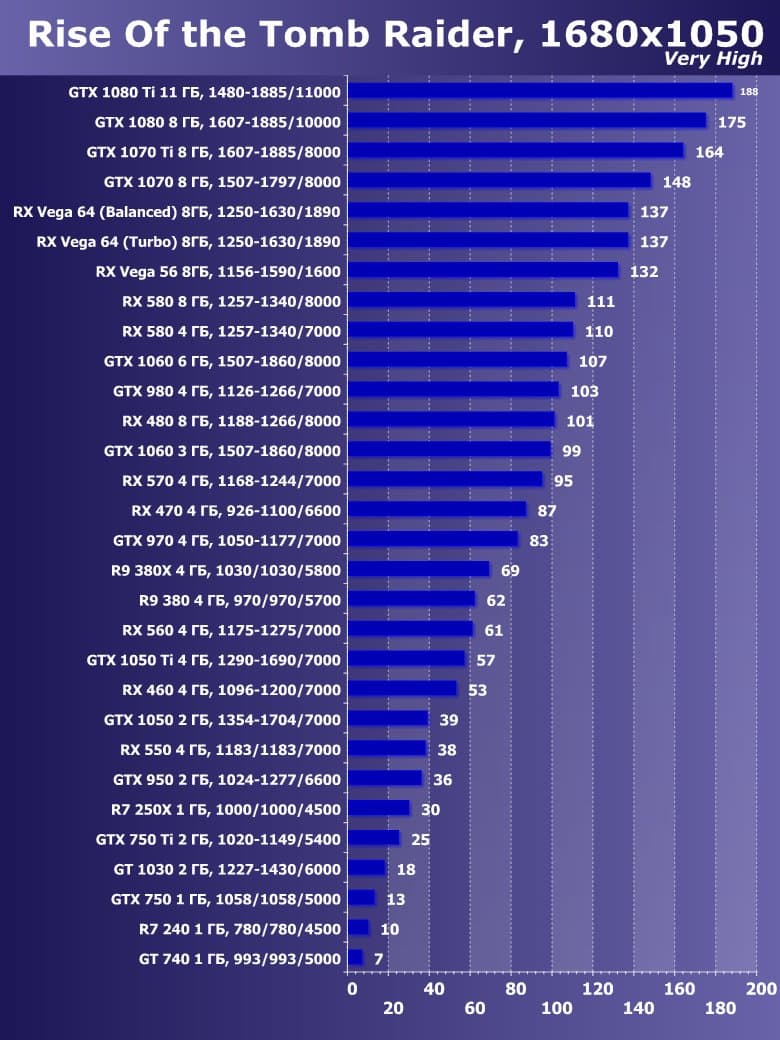 | 28 | GTX 750 1 ГБ, 1058/1058/5000 | 257 | 180 | 7000 |