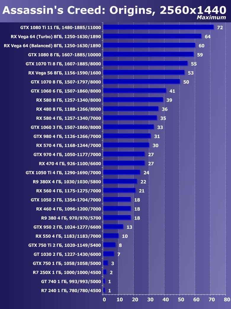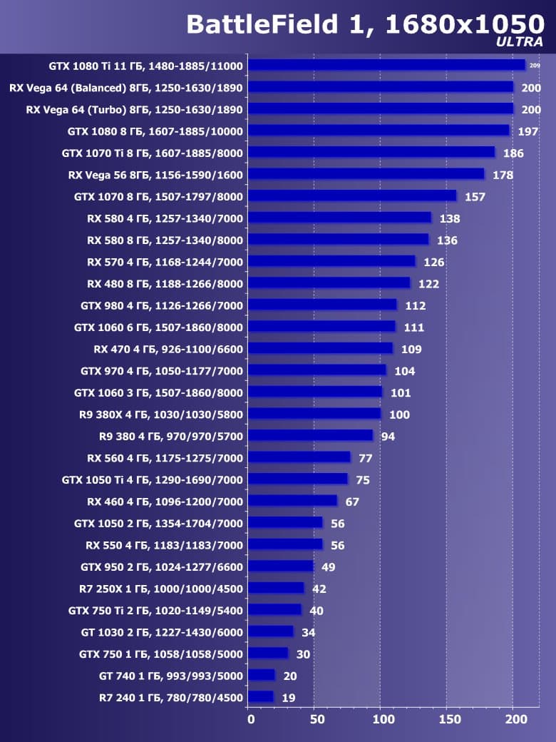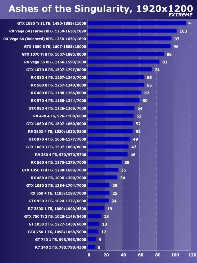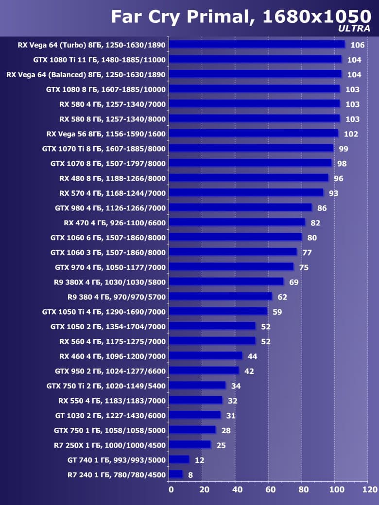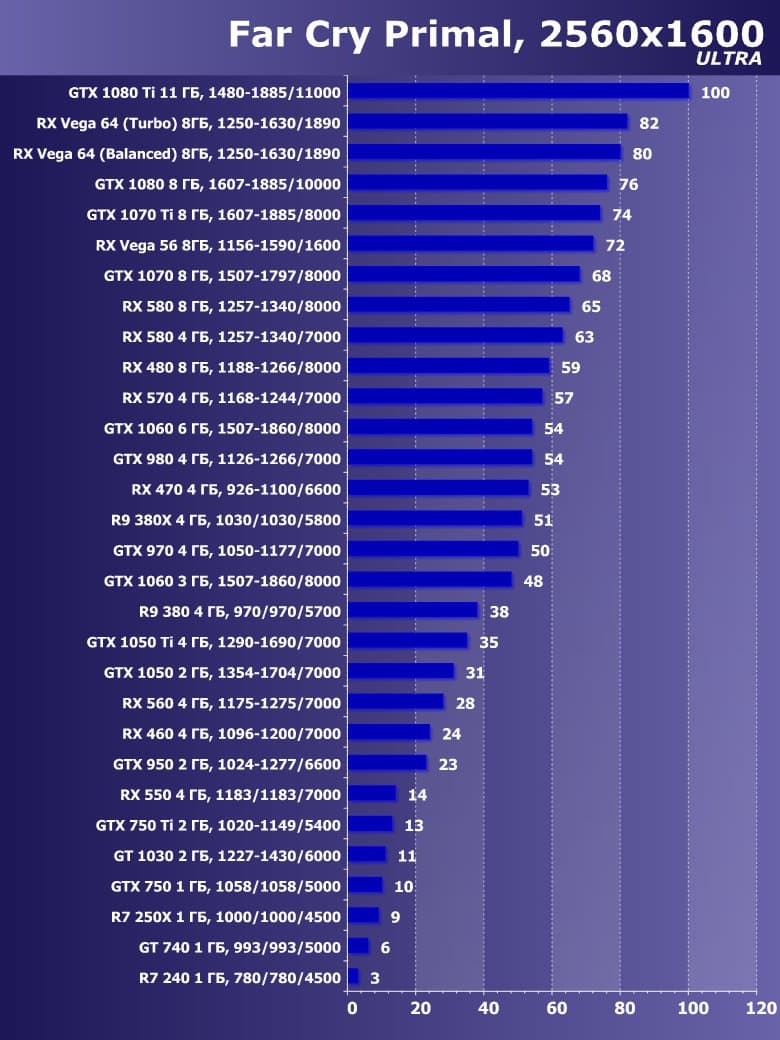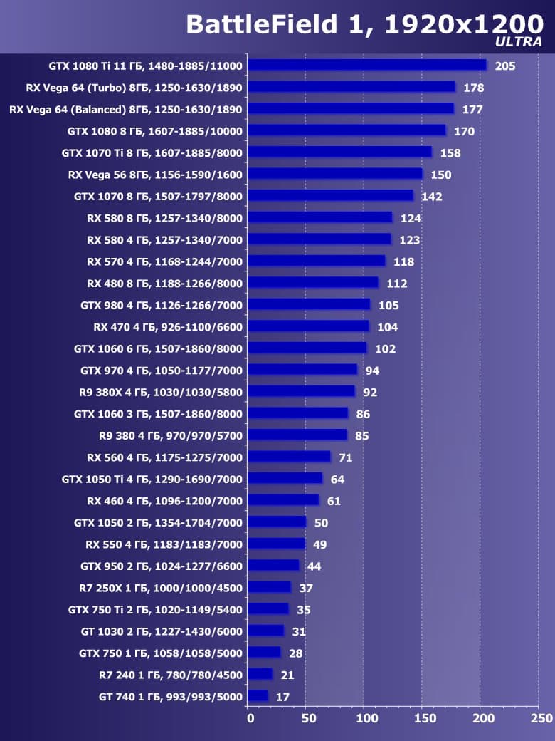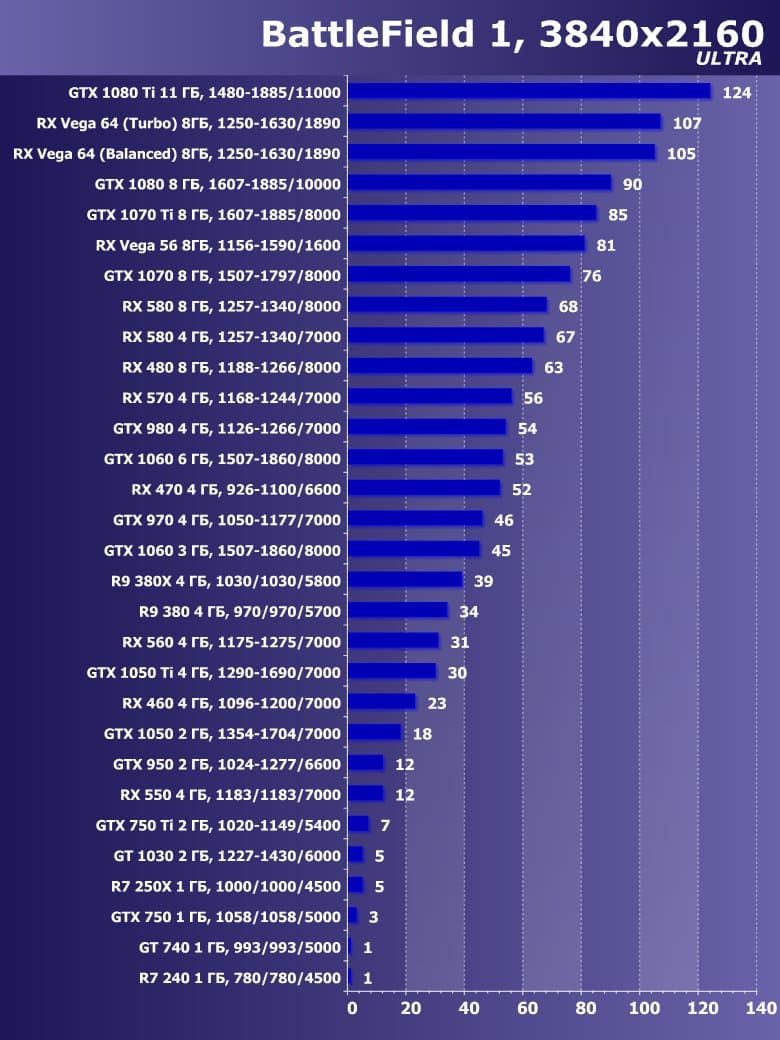 | 21 | RX 460 4 ГБ, 1096—1200/7000 | 720 | 828 | 8700 |