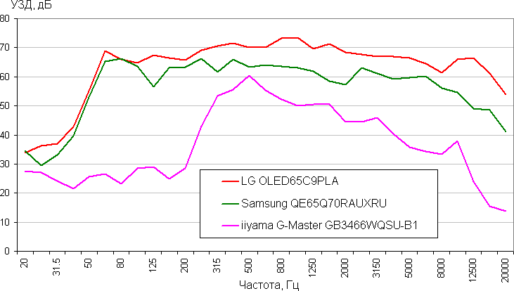 Качество встроенных громкоговорителей также невысокое. Даже для сидящего перед монитором пользователя они негромкие, низких частот нет совсем, есть выраженный «пластиковый» призвук из-за резонансов корпуса, стереофонический эффект слабый. Сравним АЧХ этого монитора с АЧХ двух телевизоров высшего класса (воспроизводился розовый шум, уровни звукового давления в 1/3 октавах записывал шумомер Октава-110А-Эко, 30 дБ — это примерно фоновый уровень шума):