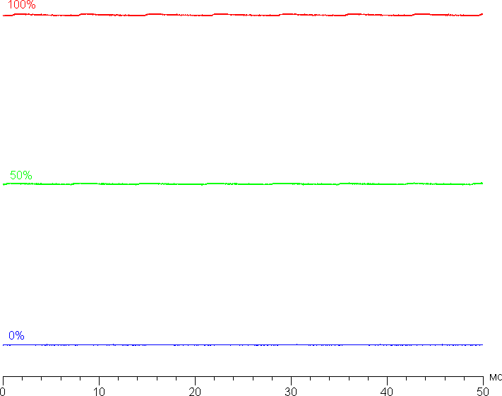 На любом уровне яркости модуляция подсветки отсутствует, что исключает видимое мерцание экрана. Для тех, кто привык распознавать знакомое сокращение, уточним: ШИМ отсутствует. В доказательство приведем графики зависимости яркости (вертикальная ось) от времени (горизонтальная ось) при различных значениях настройки яркости: