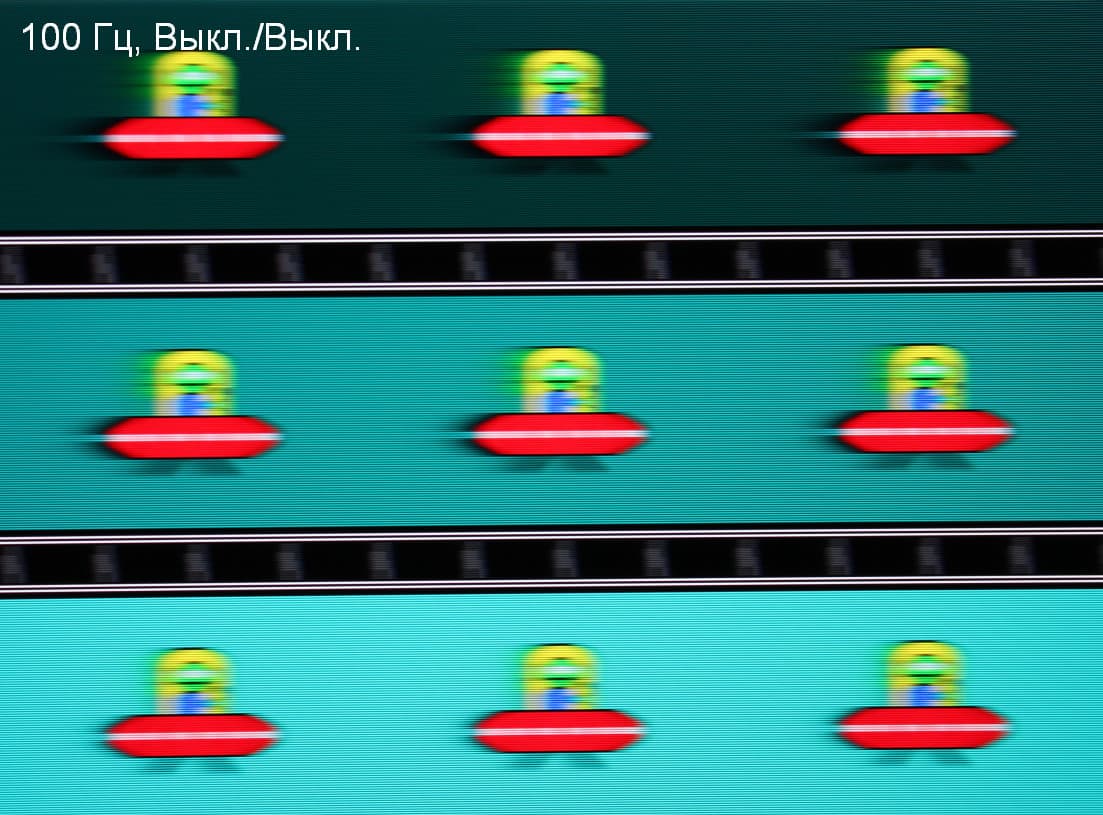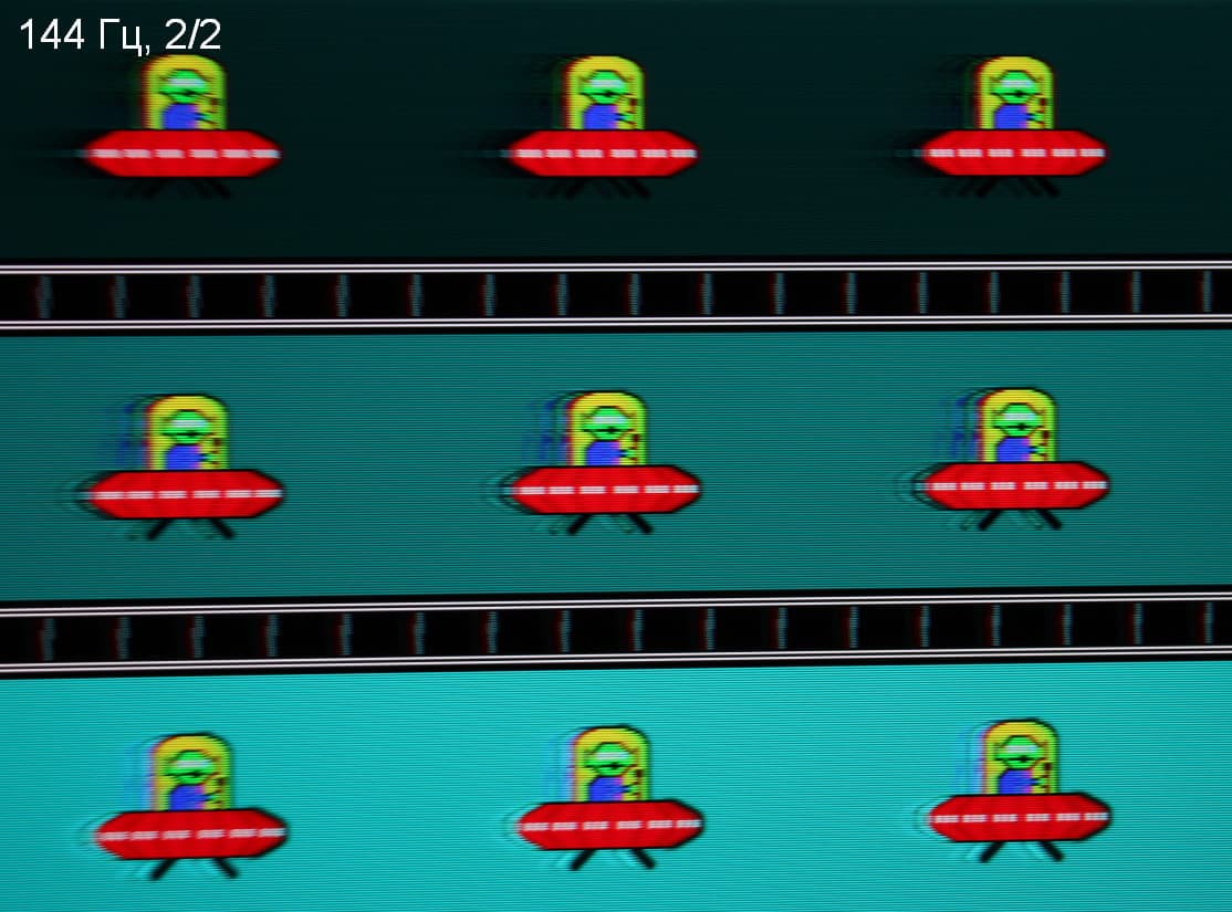 Для наглядного представления о том, что на практике означает такая скорость матрицы, какие могут быть артефакты от разгона и повышает ли четкость в движении, описанная выше настройка MBR, приведем серию снимков, полученных с помощью движущейся камеры. Такие снимки показывают, что видит человек, если он следит глазами за двигающимся на экране объектом. Описание теста приведено тут, страница с самим тестом тут. Отметим, что получить хорошие по качеству снимки в этом тесте в случае изогнутого монитора сложно. Использовались рекомендованные установки (скорость движения 960 пиксель/с), выдержка 1/15 с, на фотографиях указаны значения частоты обновления, а также настроек Overdrive / MBR. Отметим, что при включении MBR безальтернативно выбирается максимальный разгон.