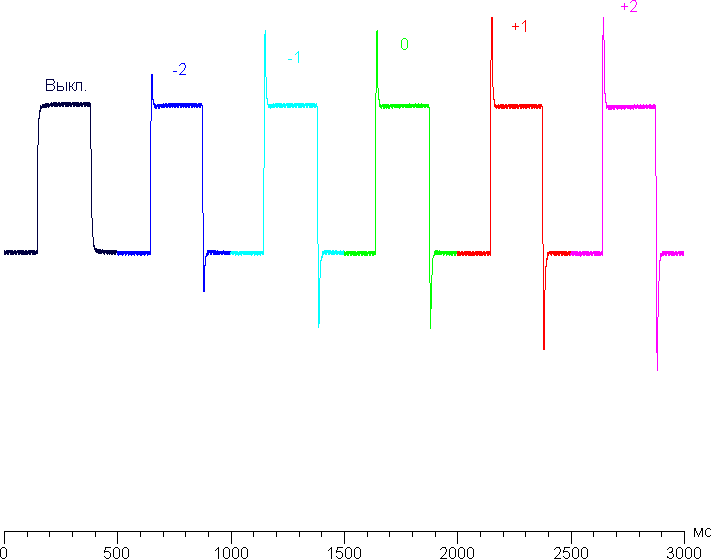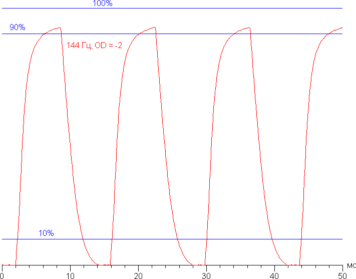 Приведем зависимости яркости (вертикальная ось) от времени (горизонтальная ось) при чередовании белого и черного кадра при 144 Гц кадровой частоты (первая ступень разгона, хотя на других все также):