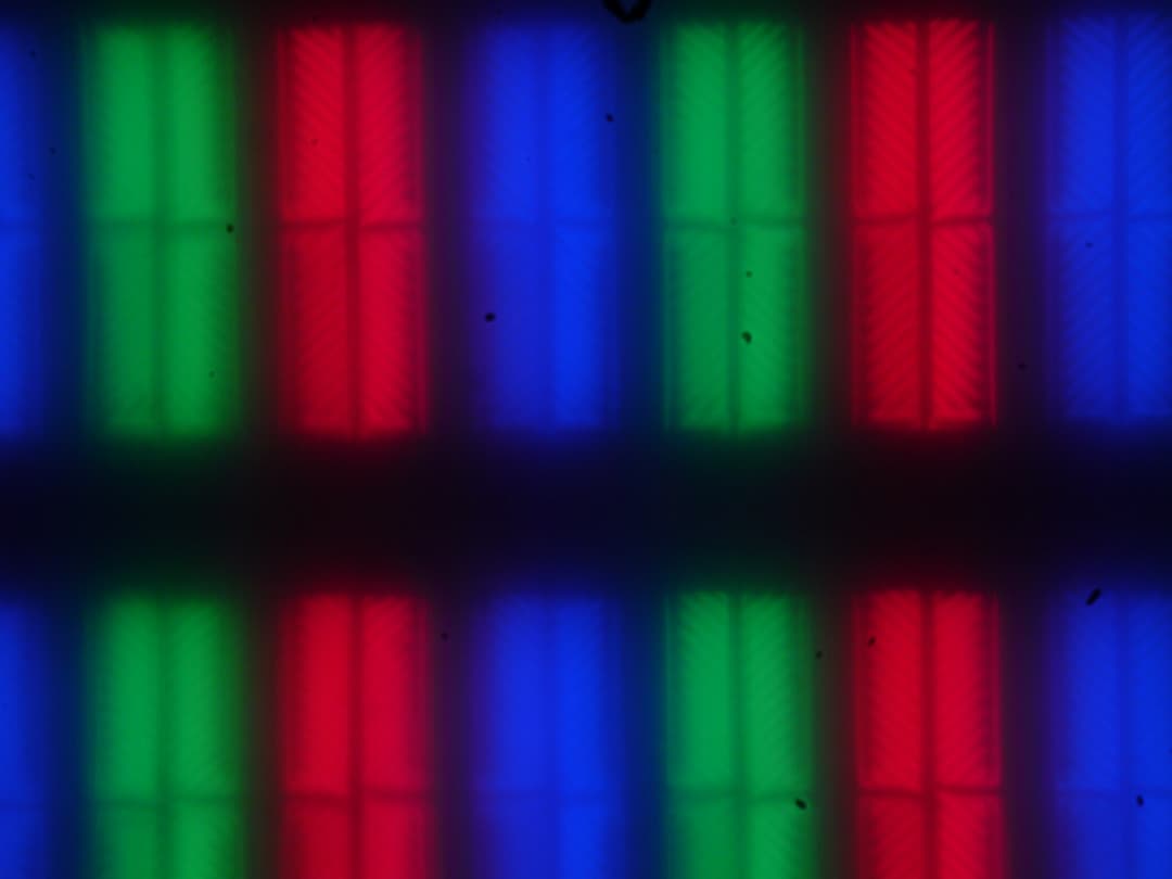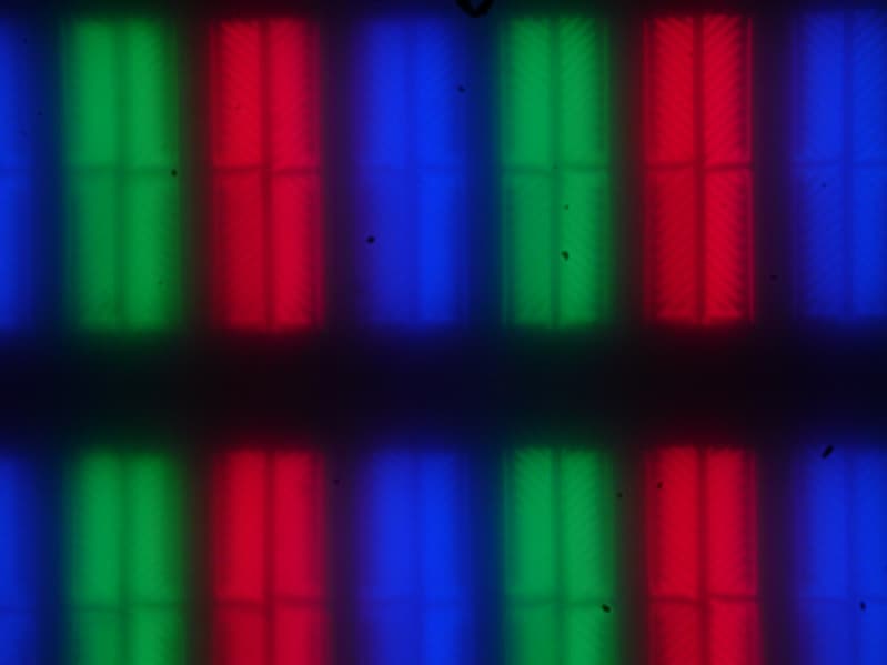 Четкое изображение структуры пикселей из-за матовой поверхности получить не удается, впрочем, на фрагменте ниже можно разглядеть типичную для VA структуру в виде параллельных полосок, а также что каждый субпиксель делится на четыре равных домена, в которых полоски ориентированы под разными углами (черные точки — это пыль на матрице фотоаппарата):