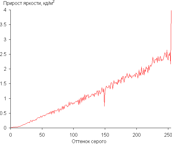 По значению показателя реальная гамма-кривая ближе всего к стандартной при выборе Гамма = 2.2, поэтому далее мы измерили яркость 256 оттенков серого (от 0, 0, 0 до 255, 255, 255) при этом значении. График ниже показывает прирост (не абсолютное значение!) яркости между соседними полутонами: