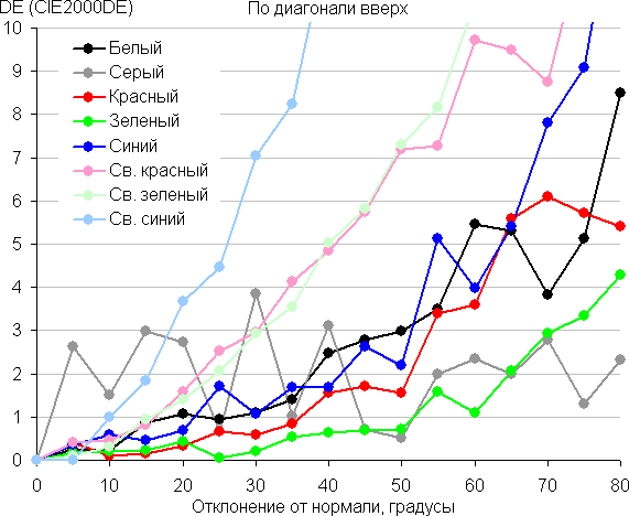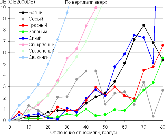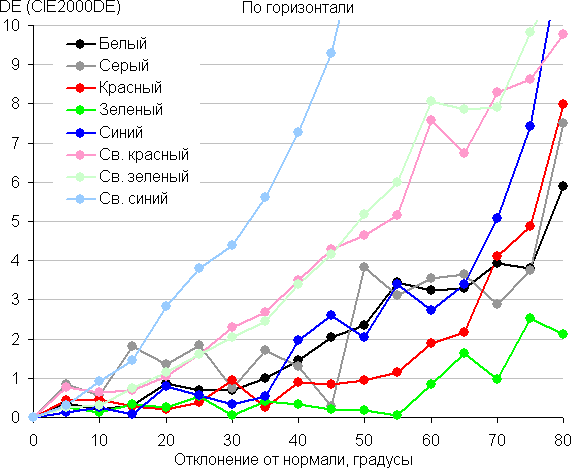 Для количественной характеристики изменения цветопередачи мы провели колориметрические измерения для белого, серого (127, 127, 127), красного, зеленого и синего, а также светло-красного, светло-зеленого и светло-синего полей во весь экран с использованием установки, подобной той, что применялась в предыдущем тесте. Измерения проводились в диапазоне углов от 0° (датчик направлен перпендикулярно к экрану) до 80° с шагом в 5°. Полученные значения интенсивностей были пересчитаны в ΔE относительно замера каждого поля при перпендикулярном положении датчика относительно экрана. Результаты представлены ниже: