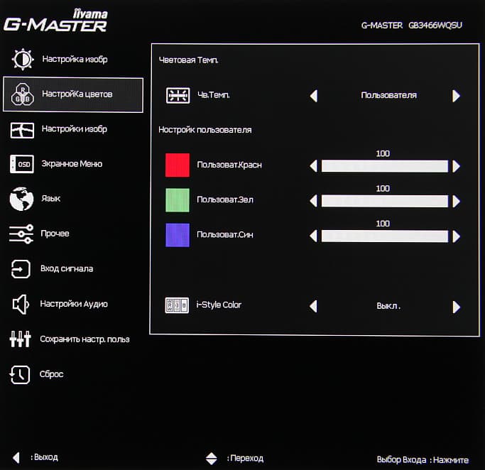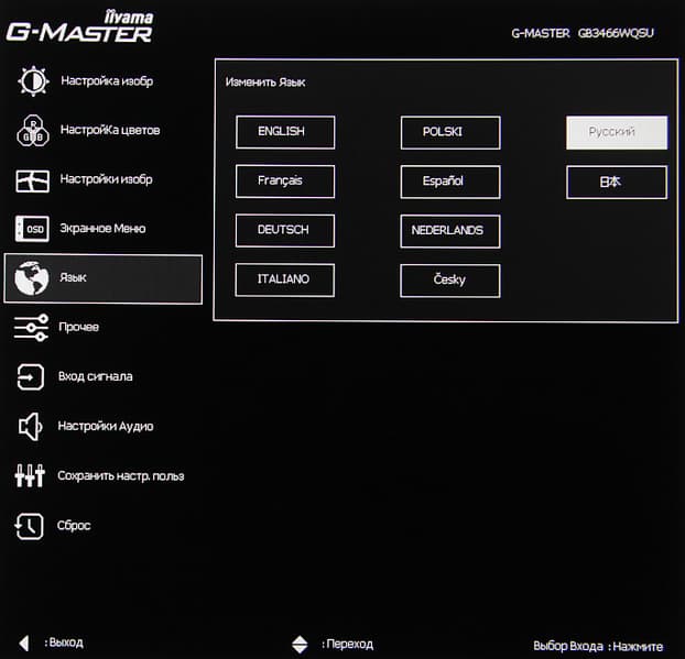 Далее можно выйти из этого меню (отклонение вниз) или выбрать один из значков, чтобы сразу попасть на нужную страницу в меню. При навигации по меню в нижней его части выводятся подсказки по текущим функциям джойстика. Меню достаточно крупное, надписи читаемые. Навигация удобная, так как все делается только джойстиком, не нужно переносить палец на кнопки, к тому же списки зациклены. При настройке изображения меню остается на экране — это несколько мешает оценке вносимых изменений. Настраивается положение меню на экране и задержка автоматического выхода из меню. Присутствует русская версия экранного меню.