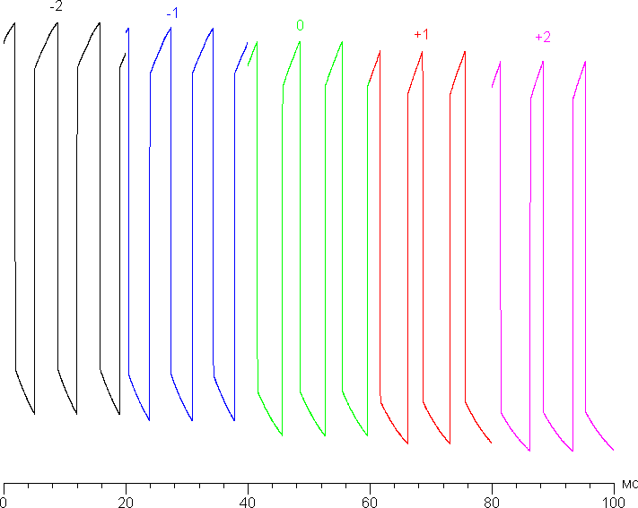 Есть режим со вставкой черного кадра (правда истинно черным он в данном случае не является) с названием MBR. Зависимости яркости (вертикальная ось) от времени (горизонтальная ось) для пяти значений соответствующего параметра (от −2 до 2):