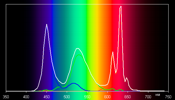 В итоге цвета обычных изображений, ориентированных на вывод на устройствах с охватом sRGB, выглядят неестественно насыщенными. Ниже приведен спектр для белого поля (белая линия), наложенный на спектры красного, зеленого и синего полей (линии соответствующих цветов), когда в явном виде нет корректировки цветового охвата