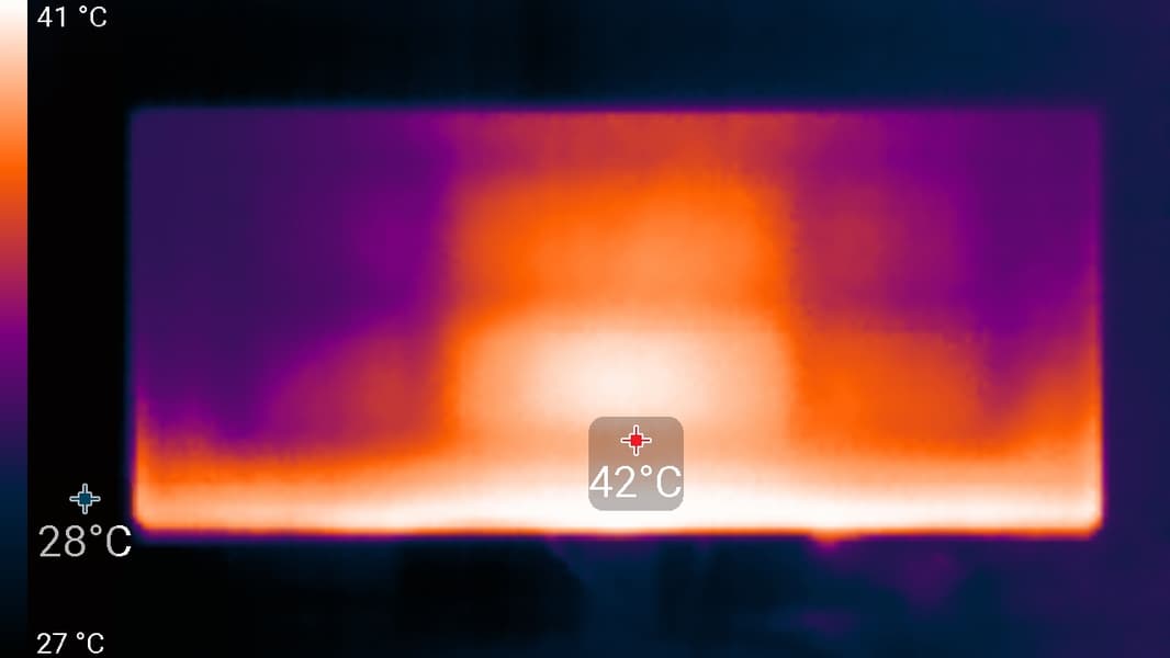 По распределению областей нагрева, можно предположить, что внизу находится светодиодная линейка подсветки экрана. Нагрев сзади умеренный.