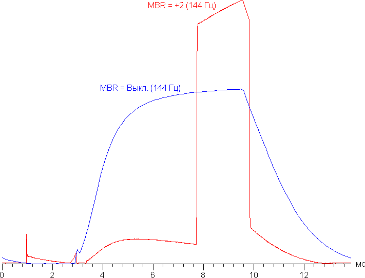 Двоение/троение объектов в динамике при включении функции MBR объясняет следующий график, на котором приведены зависимости яркости при чередовании белого и черного кадра при 144 Гц кадровой частоты для вариантов выключенной функцией MBR и с включенной: