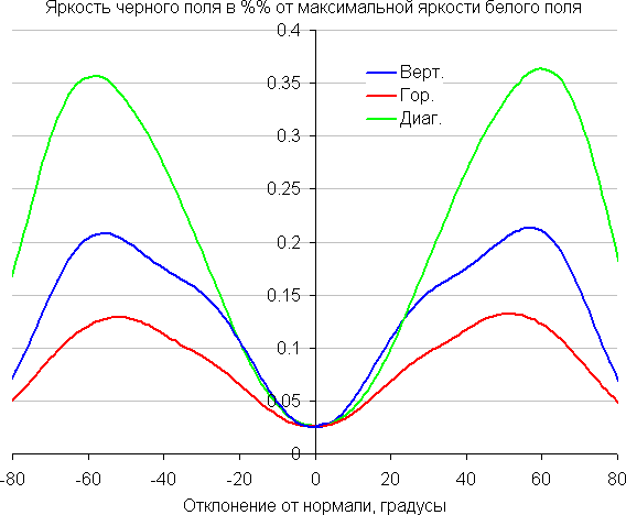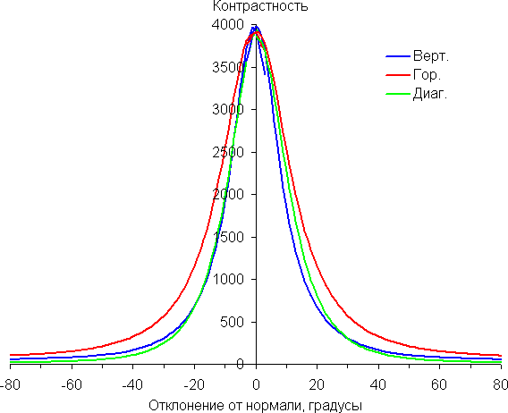 По скорости падения яркости углы обзора не очень широкие. Отметим примерно одинаковый характер уменьшения яркости при отклонении от перпендикуляра к экрану во всех трех направлениях, при этом графики не пересекаются во всем диапазоне измеряемых углов. При отклонении в диагональном направлении яркость черного поля достигает большего значения, чем в двух других случаях. Однако максимум яркости черного поля все равно меньше, чем в случае типичного монитора на матрице IPS. Контрастность в диапазоне углов ±82° приближается к отметке 10:1 только при отклонении по диагонали, но все равно остается существенно выше этого значения.