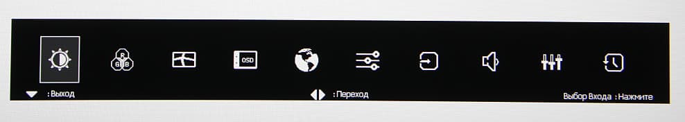 Индикатор питания при работе неярко светится синим (это можно отключить в меню), в режиме ожидания — красным, и не горит, если монитор условно выключен. Когда монитор включен и на экране нет меню, то при первом отклонении джойстика вверх на экран выводится меню выбора входа, влево — список профилей изображения, вправо — ползунок громкости, а при нажатии на джойстик или при отклонении джойстика вниз на экран выводится стартовое меню из 10-ти значков, которые соответствуют пунктам меню верхнего уровня.