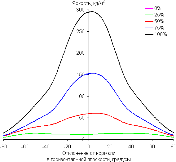 Из графиков следует, что при взгляде под углом хотя бы основные цвета меняются несильно, но полутона (особенно светло-синий) существенно изменяются, что ожидаемо для матрицы типа *VA и является ее основным недостатком.