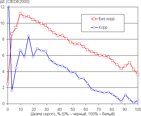 Самый близкий к черному диапазон можно не учитывать, так как в нем цветопередача не так важна, а погрешность измерения цветовых характеристик высокая. Ручная коррекция приблизила цветовую температуру к 6500 К, а заодно и уменьшила значение ΔE, правда довольно большой разброс этого параметра сохранился, что несколько ухудшает визуальное восприятие цветового баланса. Впрочем, для игрового применения это не принципиально, да и в коррекции необходимости нет.