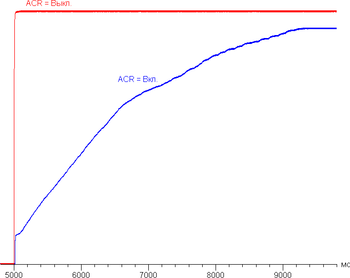 При включении режима с динамическим управлением яркости установившаяся контрастность формально возрастает до бесконечности, так как на черном поле во весь экран подсветка выключается совсем через 7 секунд. Впрочем, уже курсора мыши достаточно для включения подсветки. График ниже показывает, как увеличивается яркость (вертикальная ось) при переключении с черного поля (после пяти секунд вывода) на белое при выключенной и включенной динамической подстройке яркости: