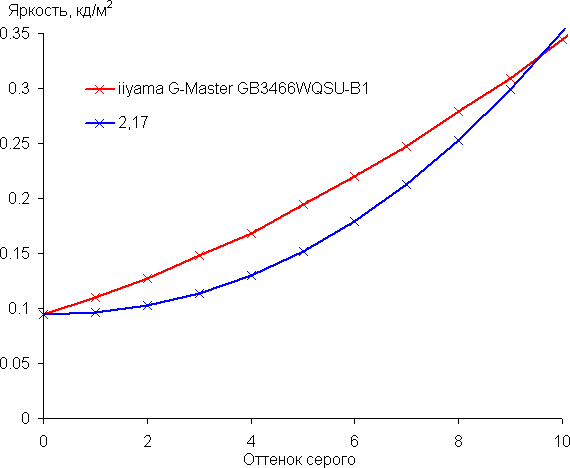Рост прироста яркости более-менее равномерный, и каждый следующий оттенок ярче предыдущего. В тенях все оттенки визуально хорошо отличаются по яркости, что для игрового монитора очень полезно: