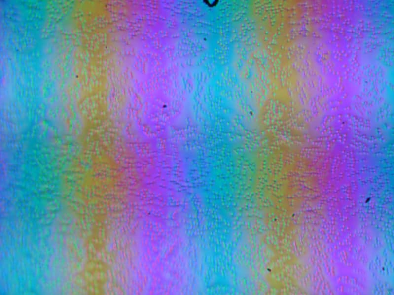 Зерно этих дефектов в несколько раз меньше размеров субпикселей, поэтому фокусировка на микродефектах и «перескок» фокуса по субпикселям при изменении угла зрения выражены слабо, из-за этого нет и «кристаллического» эффекта.