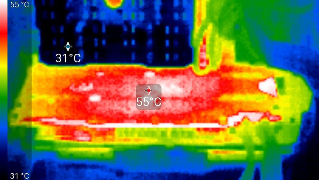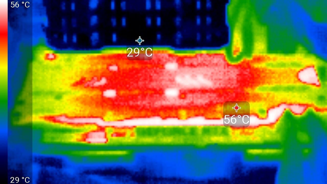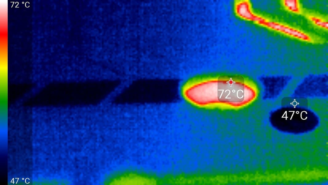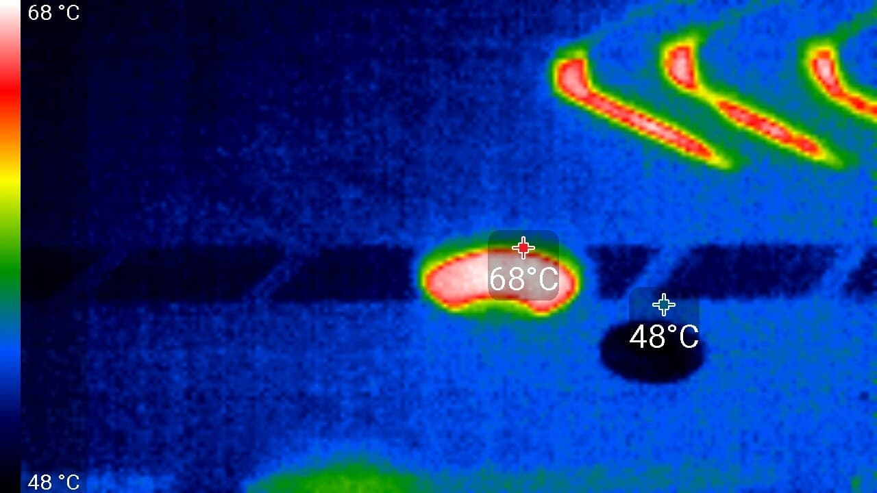 С двумя вентиляторами картина особо не меняется. Температура ядра не превысила 70 градусов. Максимальный нагрев — верхний край оборотной стороны PCB.