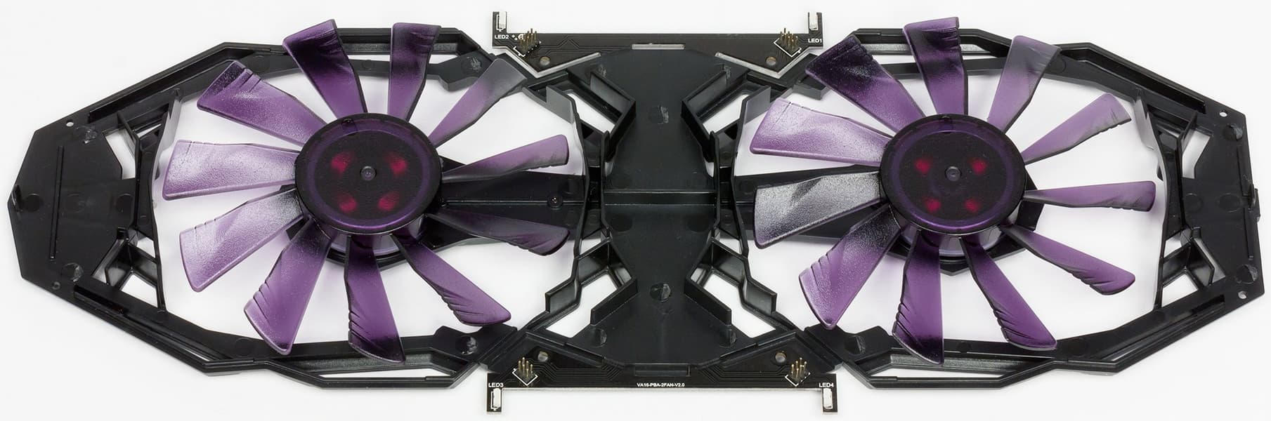 С вентиляторами тут все интересно. По умолчанию поверх радиаторов установлен кожух с тремя вентиляторами, но в комплекте поставки есть дополнительный кожух с двумя вентиляторами. Пользователь может легко демонтировать и менять кожухи без снятия всей системы охлаждения с карты. У вентиляторов, что идут в паре, имеется особый рельеф лопаток, уменьшающий шум при повышенных оборотах. При включении ПК вращается только средний вентилятор (или правый в случае установки кожуха с двумя вентиляторами). После загрузки видеодрайвера и эти вентиляторы останавливаются (это можно увидеть в видеоролике в начале статьи), а снова включаются только при нагреве GPU выше 50-55 градусов.