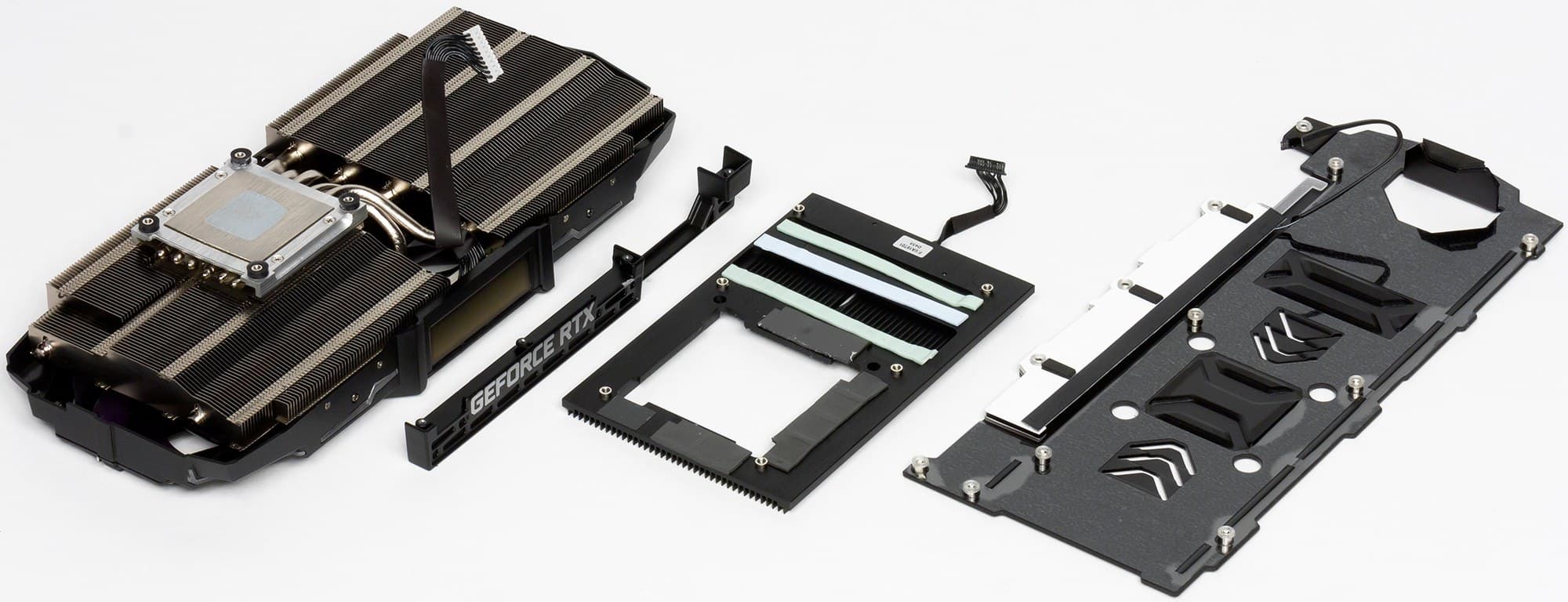 Наличие сдвоенных пластинчатых никелированных радиаторов уже стало традицией для всех видеокарт топового уровня. Столь же традиционно, тепловые трубки пронизывают обе части радиатора, помогая разносить тепло по ребрам. Микросхемы памяти и силовые элементы схемы питания охлаждаются специальной пластиной, прикрученной к радиатору (эта же пластина имеет электрокоммутатор всех элементов подсветки для единого подключения к видеокарте). На обороте карты установлена толстая пластина, служащая элементом жесткости и имеющая элементы подсветки.