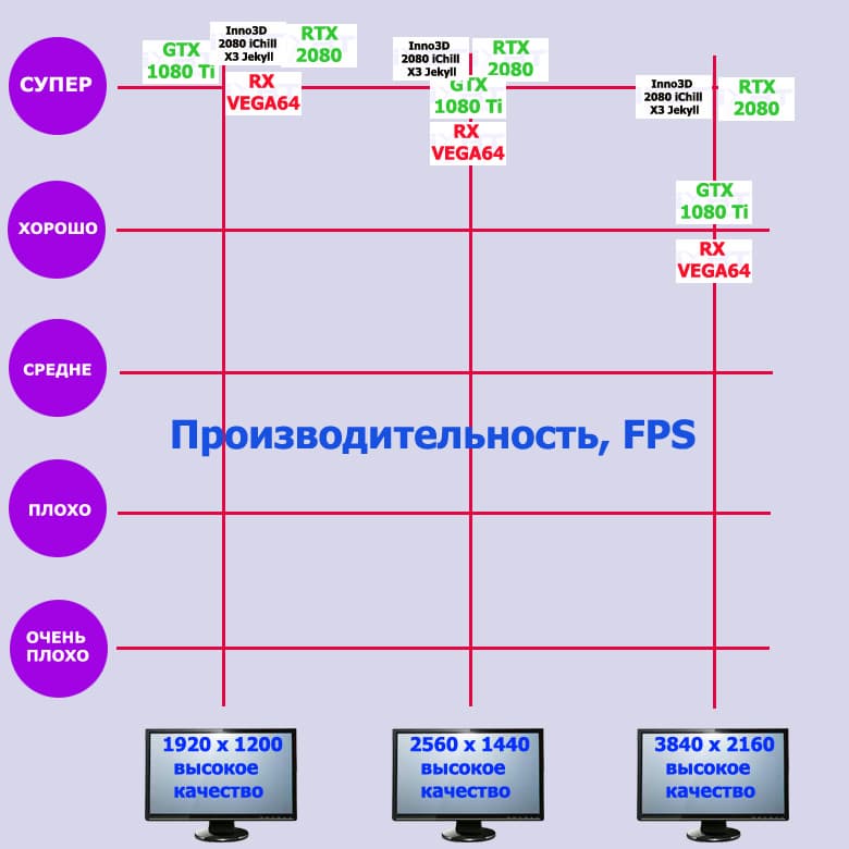 Как обычно, вначале глянем на итоговую картину производительности карты и ее соперников, субъективно оцененную нами по шкале из пяти градаций.