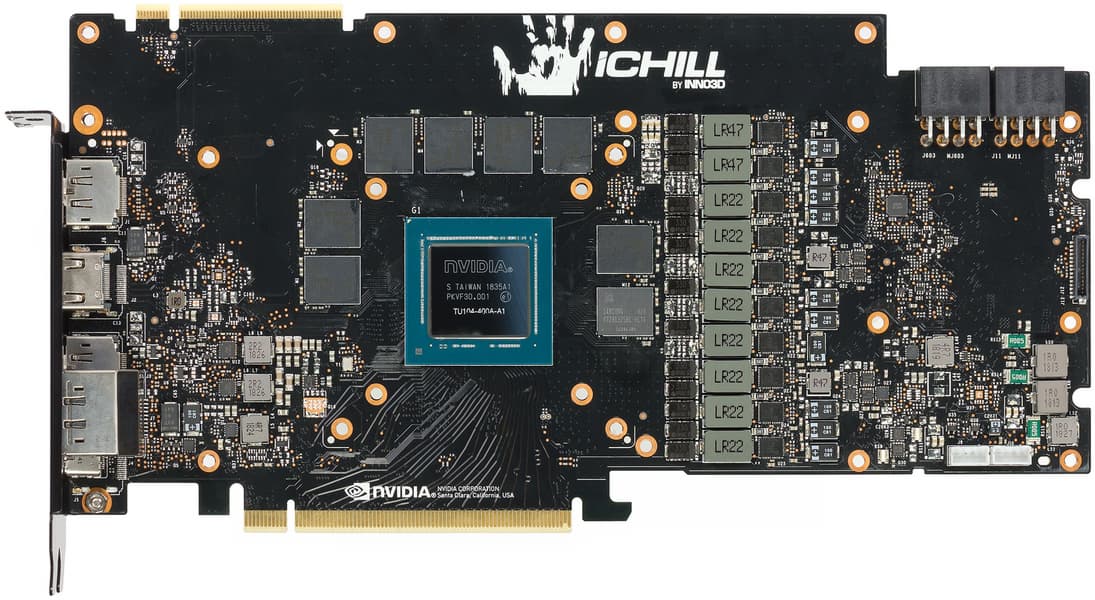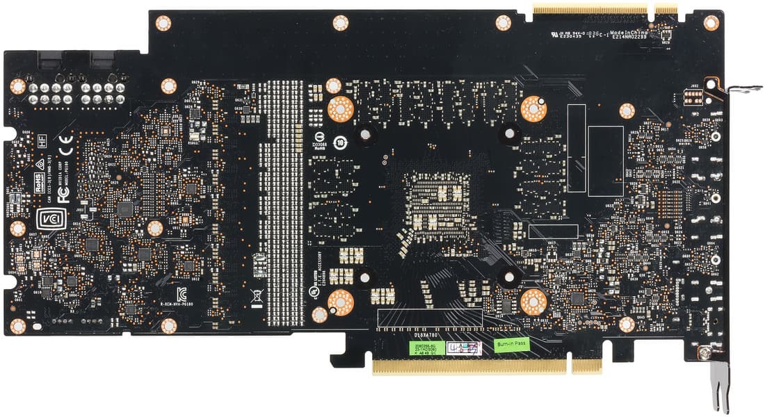 Тут я впервые понял, что Inno3D ставит логотип компании Nvidia (внизу, около разъема PCI-E) на всех своих картах. Никто более так не делает, и наличие такой надписи всегда означало, что перед нами референс-карта самой Nvidia. И когда я раньше изучал карты Inno3D, видя подобный логотип, я считал, что они просто покупали (либо заказывали) у Nvidia референс-карты, ставя на них свои системы охлаждения. Опыт изучения карт Inno3D говорил, что их платы от референса просто ничем не отличались. В данном же случае очевидно, что это не так, перед нами плод работы инженеров Inno3D, «промаркированный» как референс-дизайн. Смешно :) Хотя не могу исключить и вероятности заказа PCB на том же заводе, где выпускают Founders Edition для Nvidia.