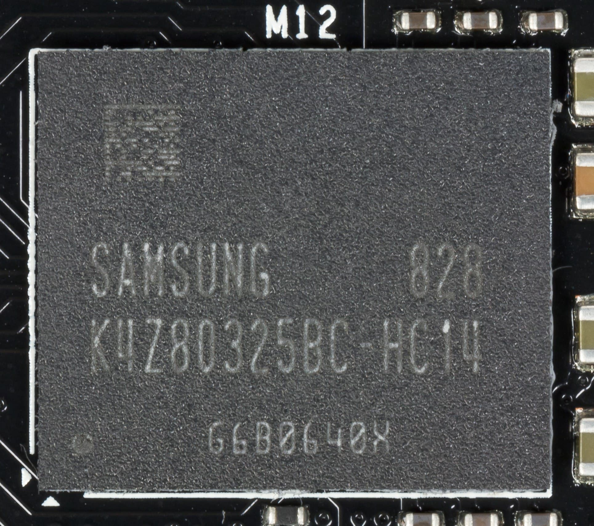 Карта имеет 8 ГБ памяти GDDR6 SDRAM, размещенной в 8 микросхемах по 8 Гбит на лицевой стороне PCB. Микросхемы памяти Samsung (GDDR6) рассчитаны на номинальную частоту работы в 3500 (14000) МГц