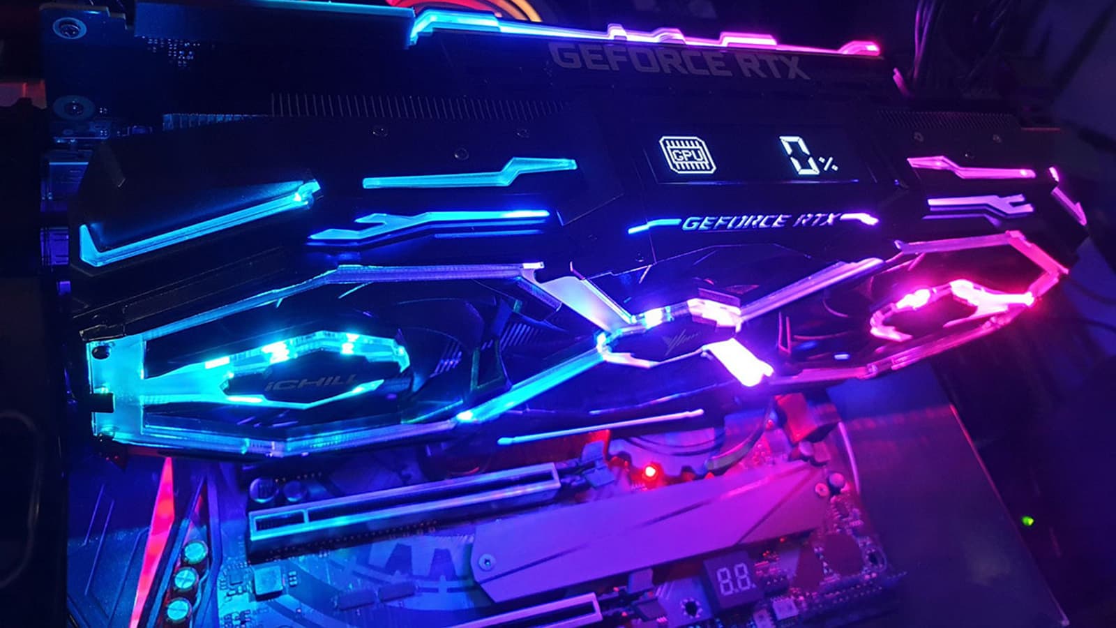 А вот режима дискотеки (светомузыки) у карты нет. Как нет и синхронизации с подсветкой материнской платы или иных RGB-устройств. Впрочем, такая карта в корпусе легко затмит все остальные «мигалки» :)