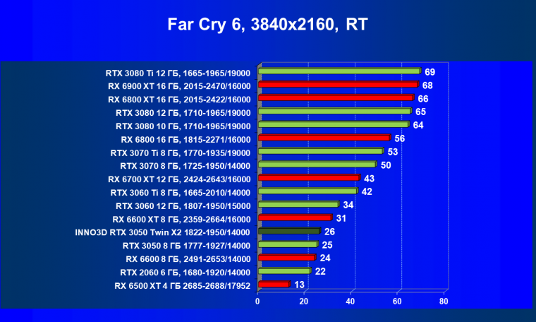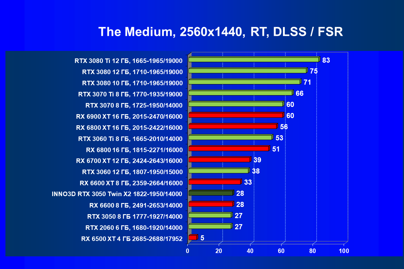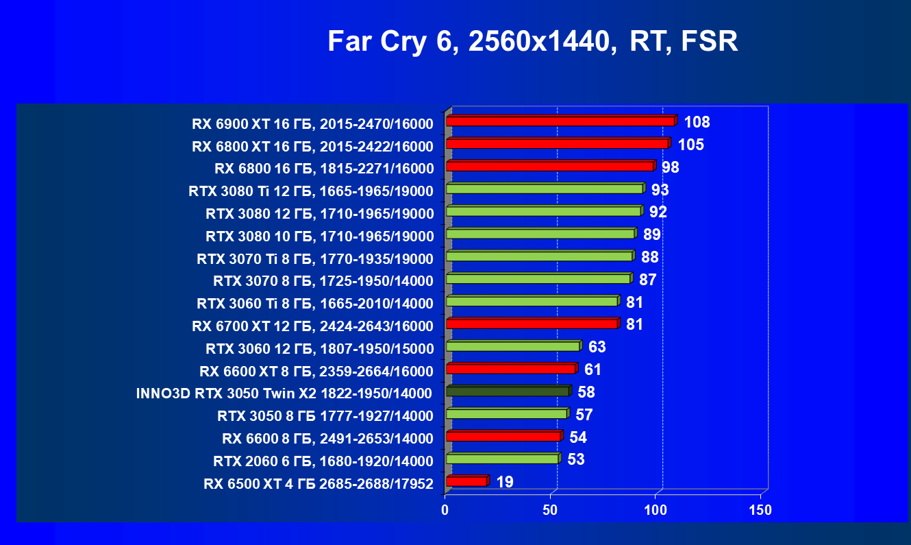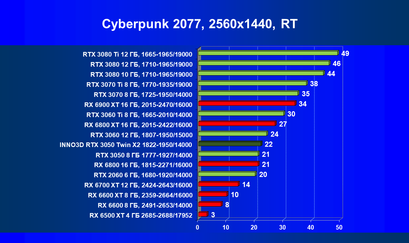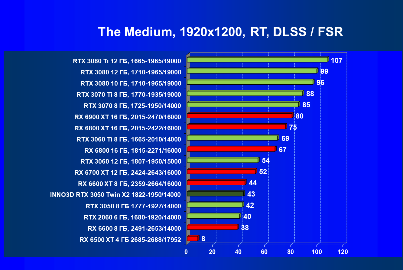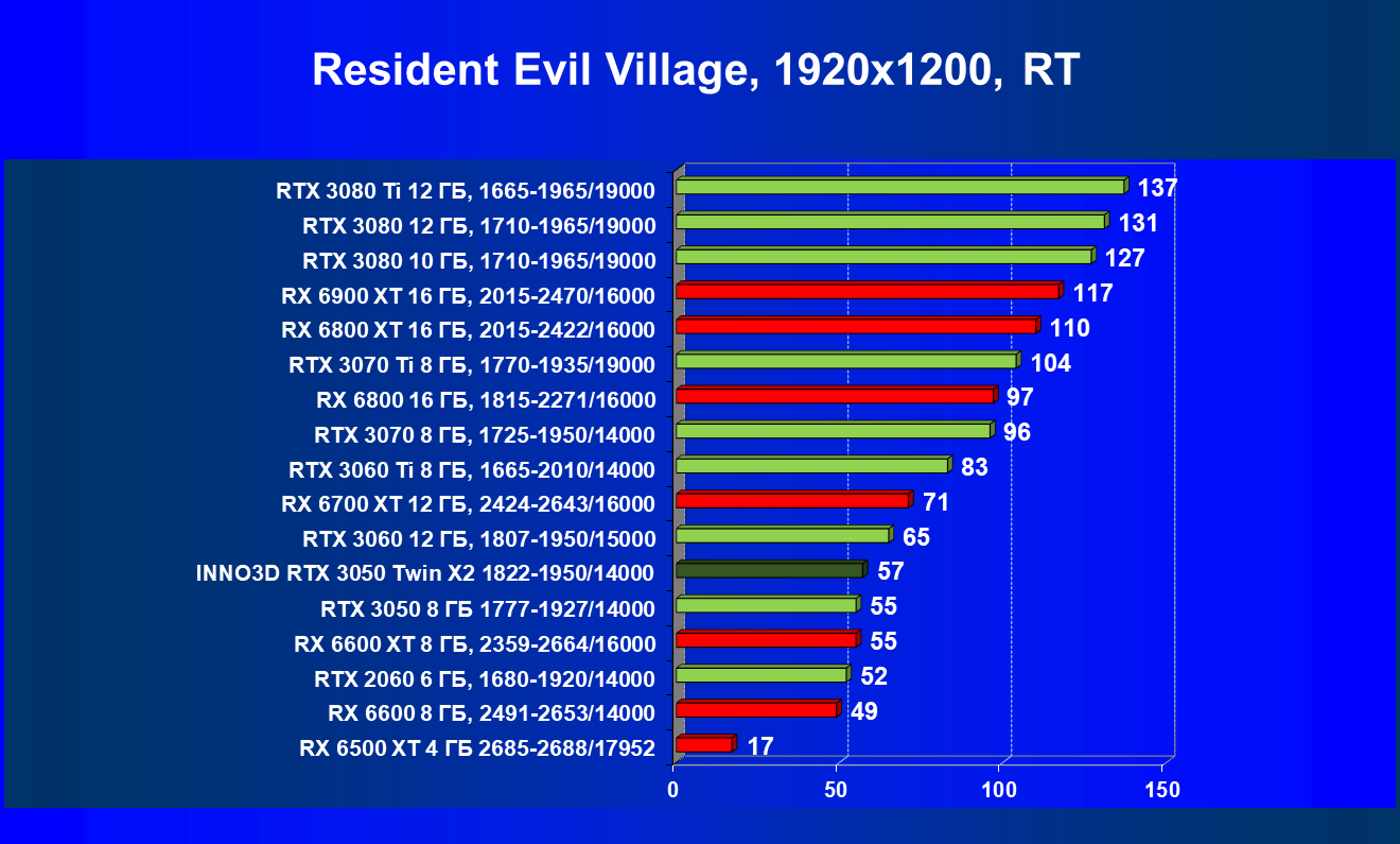 В данном случае RTX 3050 обошел не только более дорогой Radeon RX 6600, но и RX 6600 XT: даже поддержка FSR в ряде игр не помогает последнему поколению Radeon компенсировать сильное падение производительности от включения трассировки лучей. Учитывая чуть более высокие частоты работы карты Inno3D, логично смотрится лидерство этого продукта в своей группе.