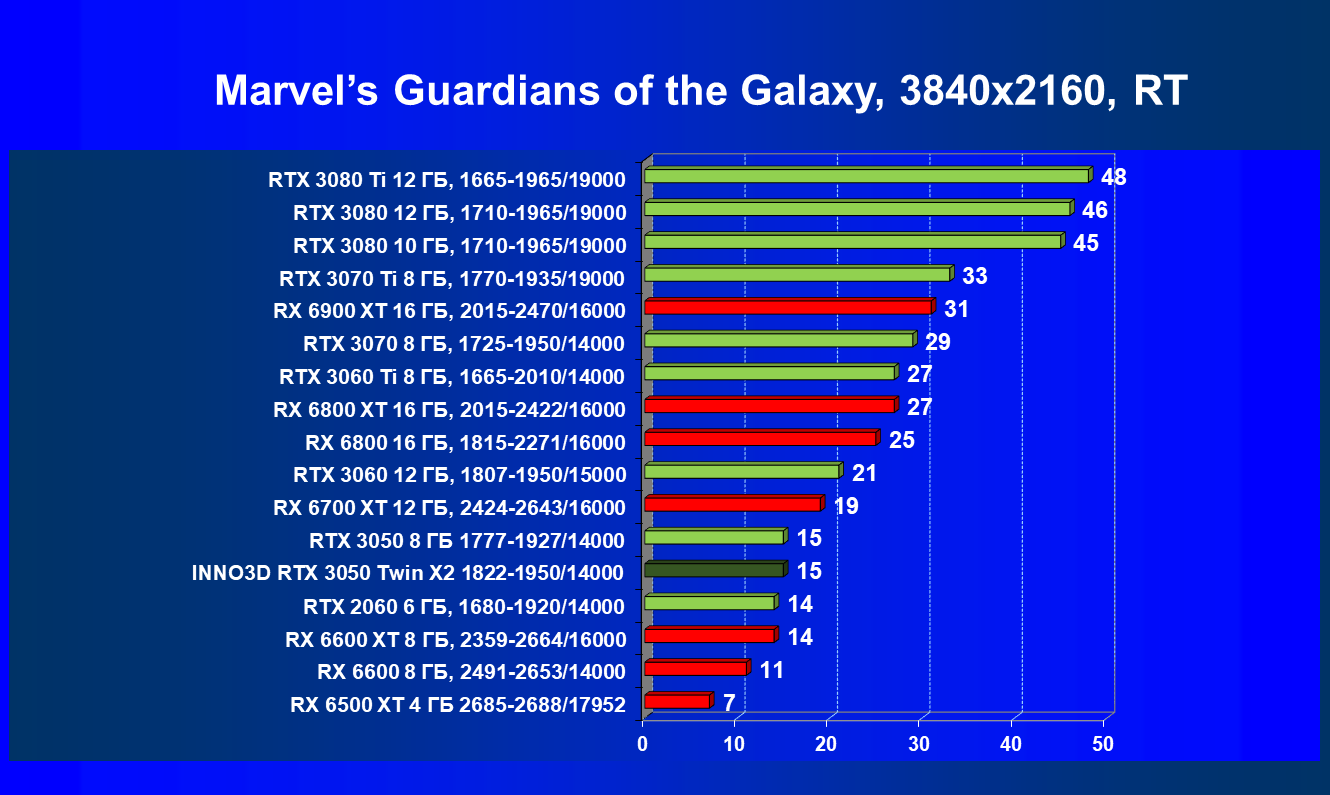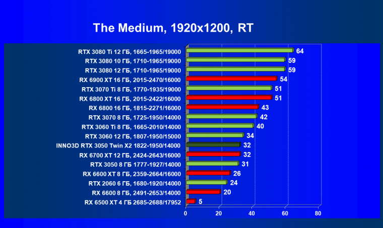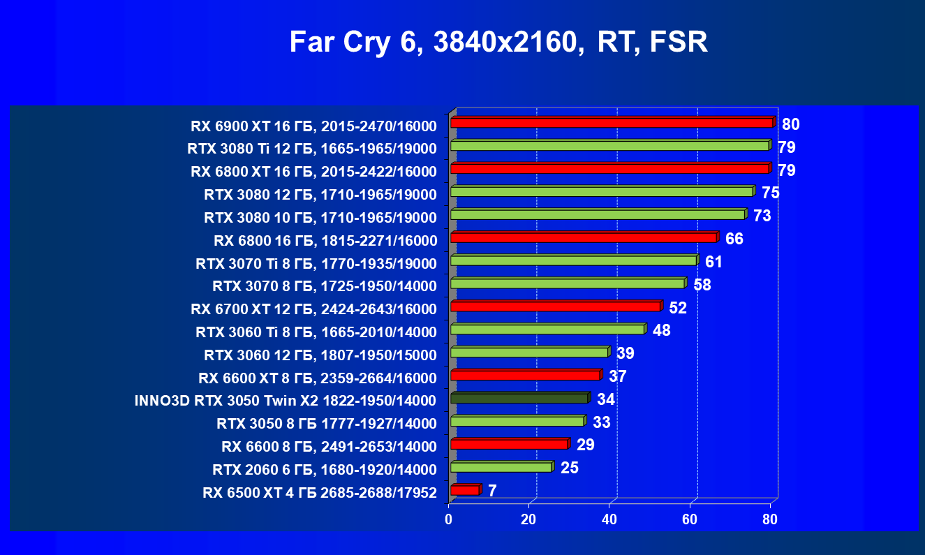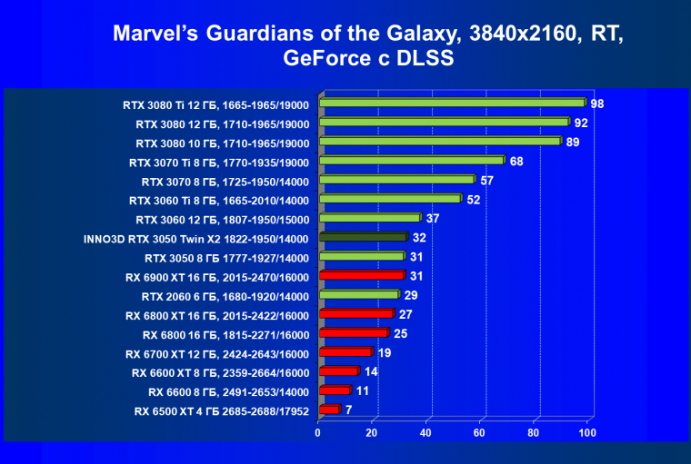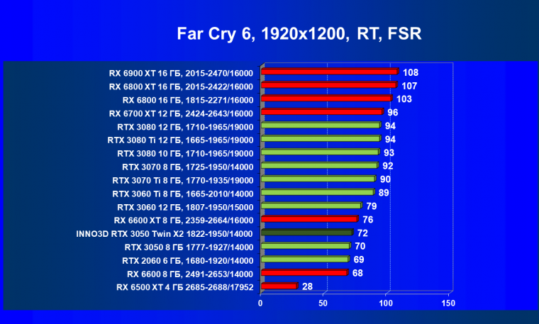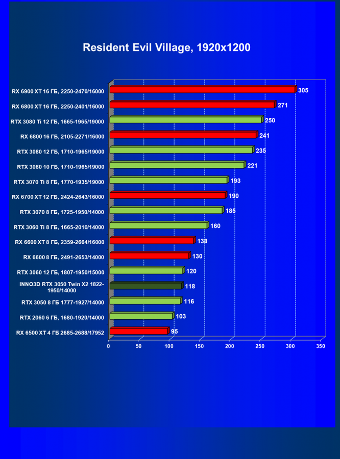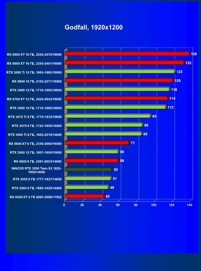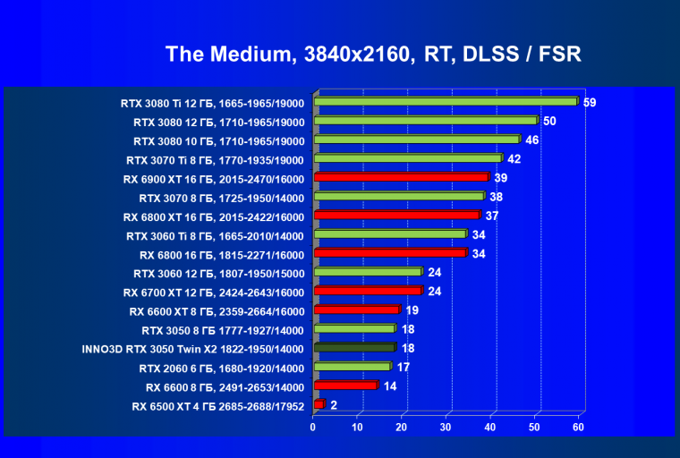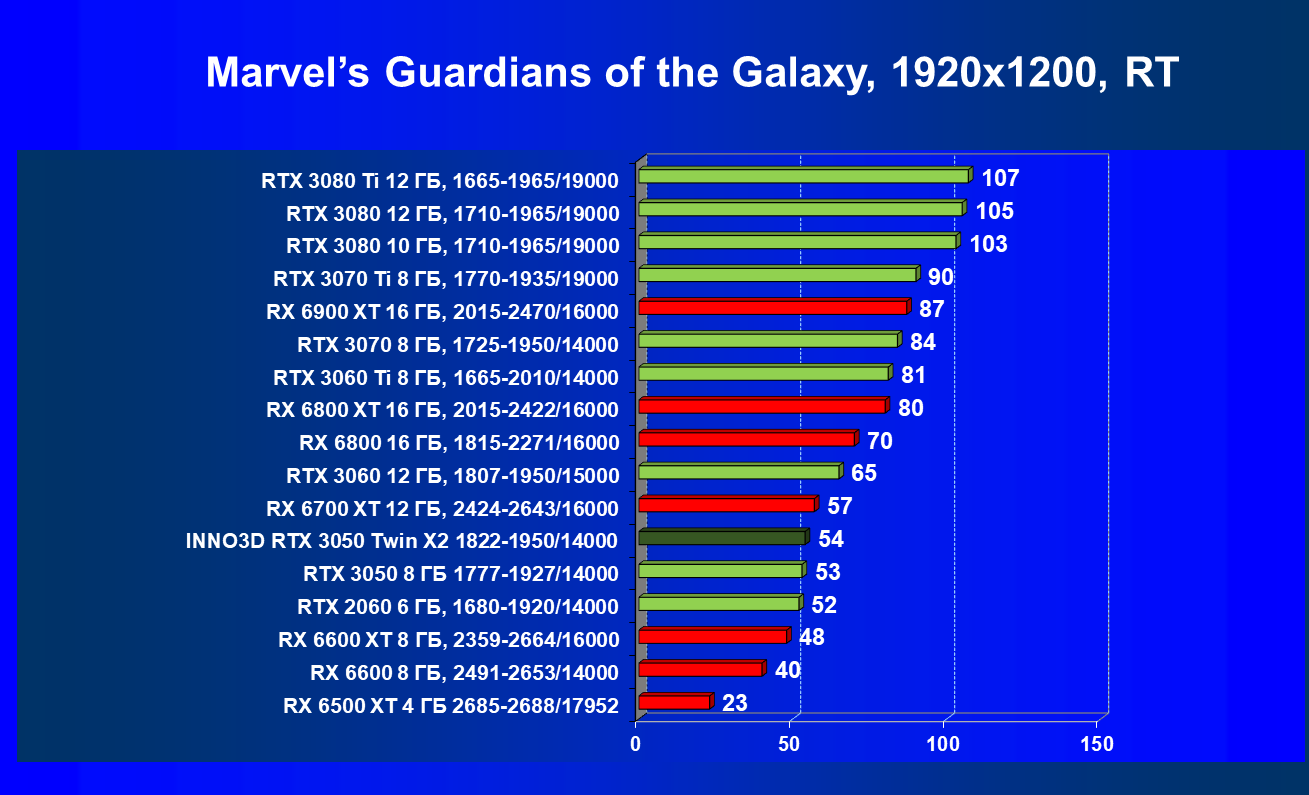 В данном случае RTX 3050 обошел не только более дорогой Radeon RX 6600, но и RX 6600 XT: даже поддержка FSR в ряде игр не помогает последнему поколению Radeon компенсировать сильное падение производительности от включения трассировки лучей. Учитывая чуть более высокие частоты работы карты Inno3D, логично смотрится лидерство этого продукта в своей группе.