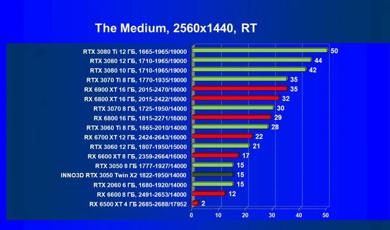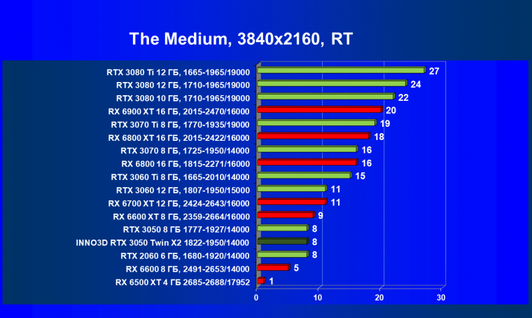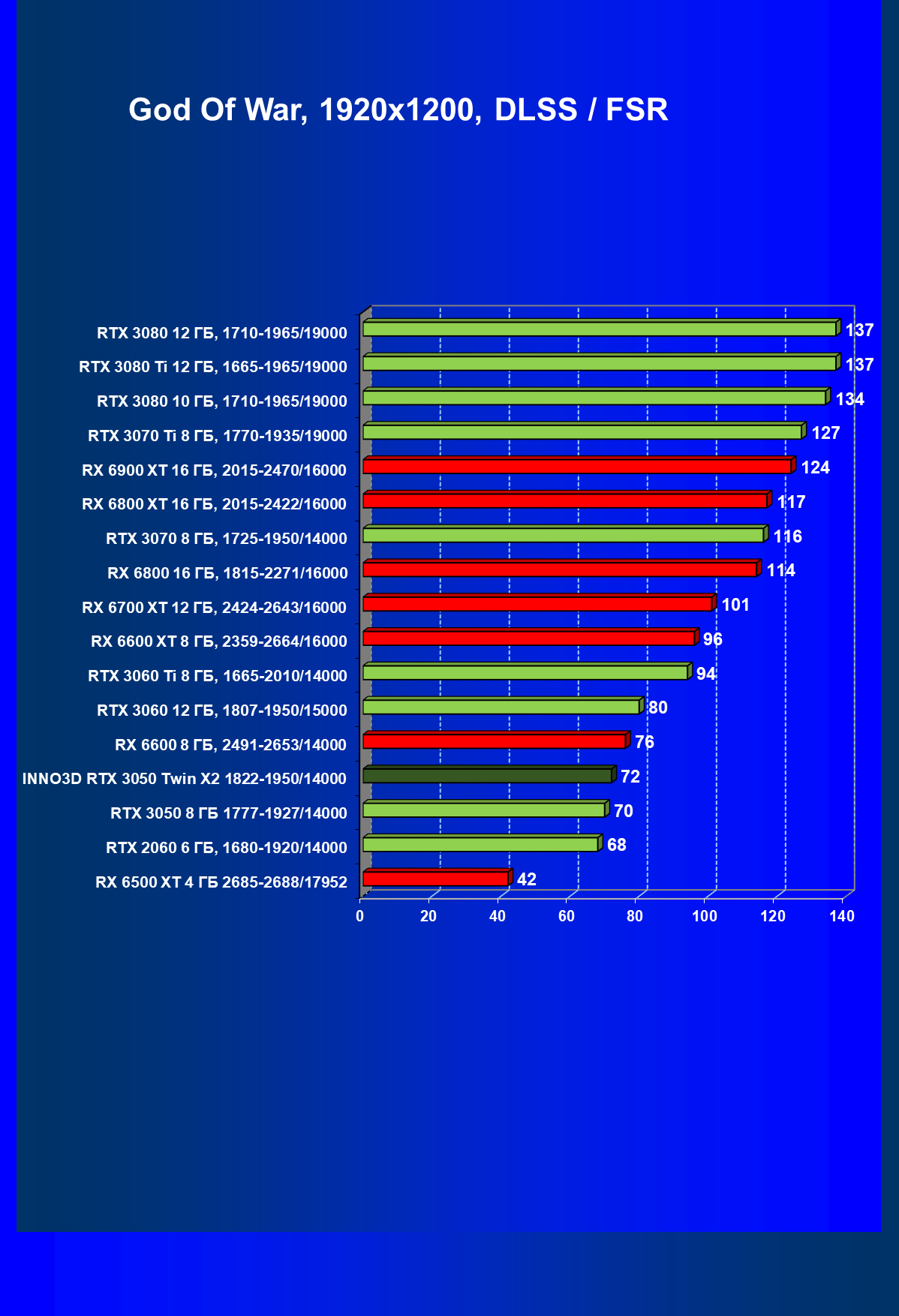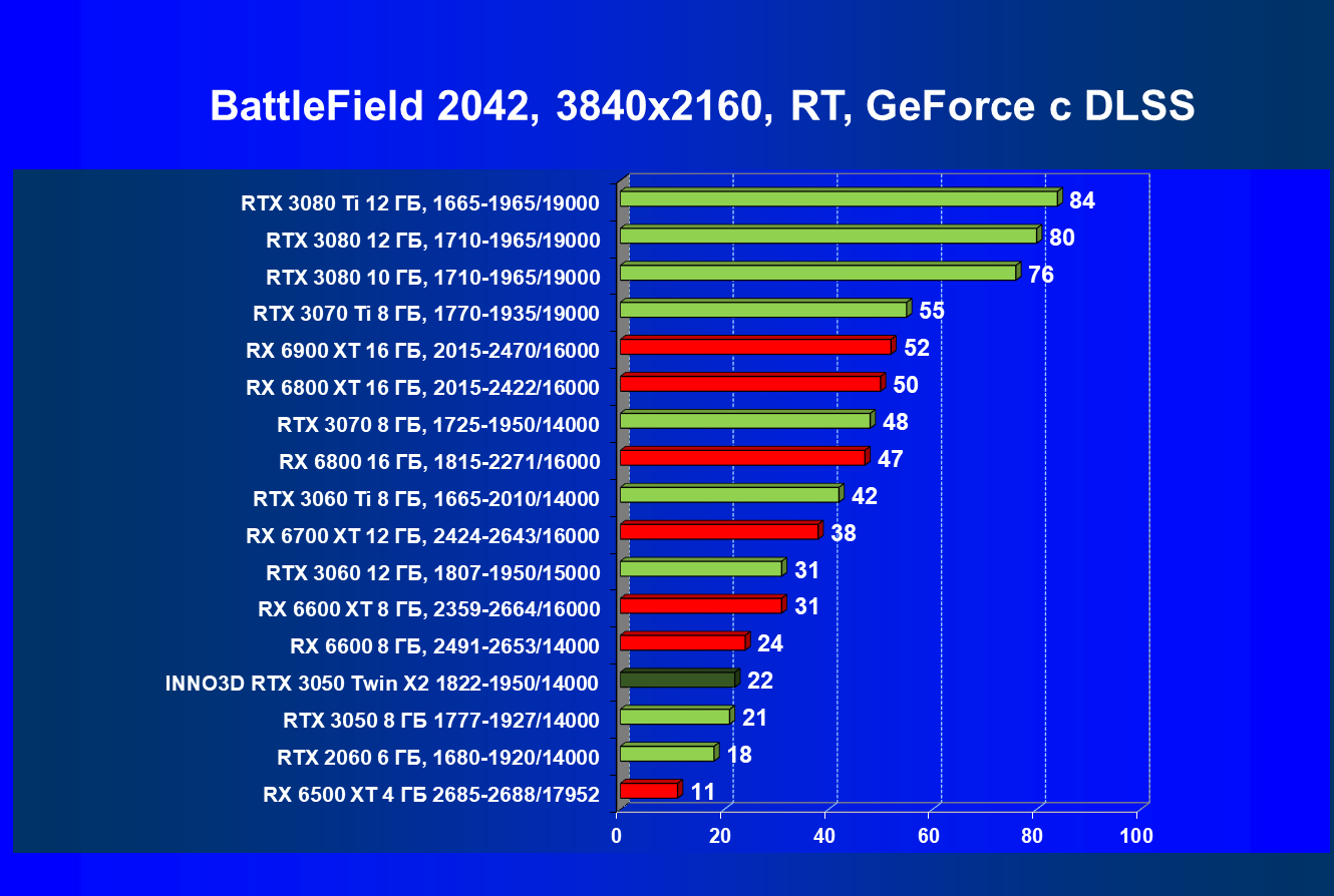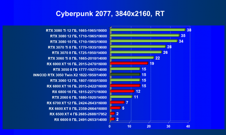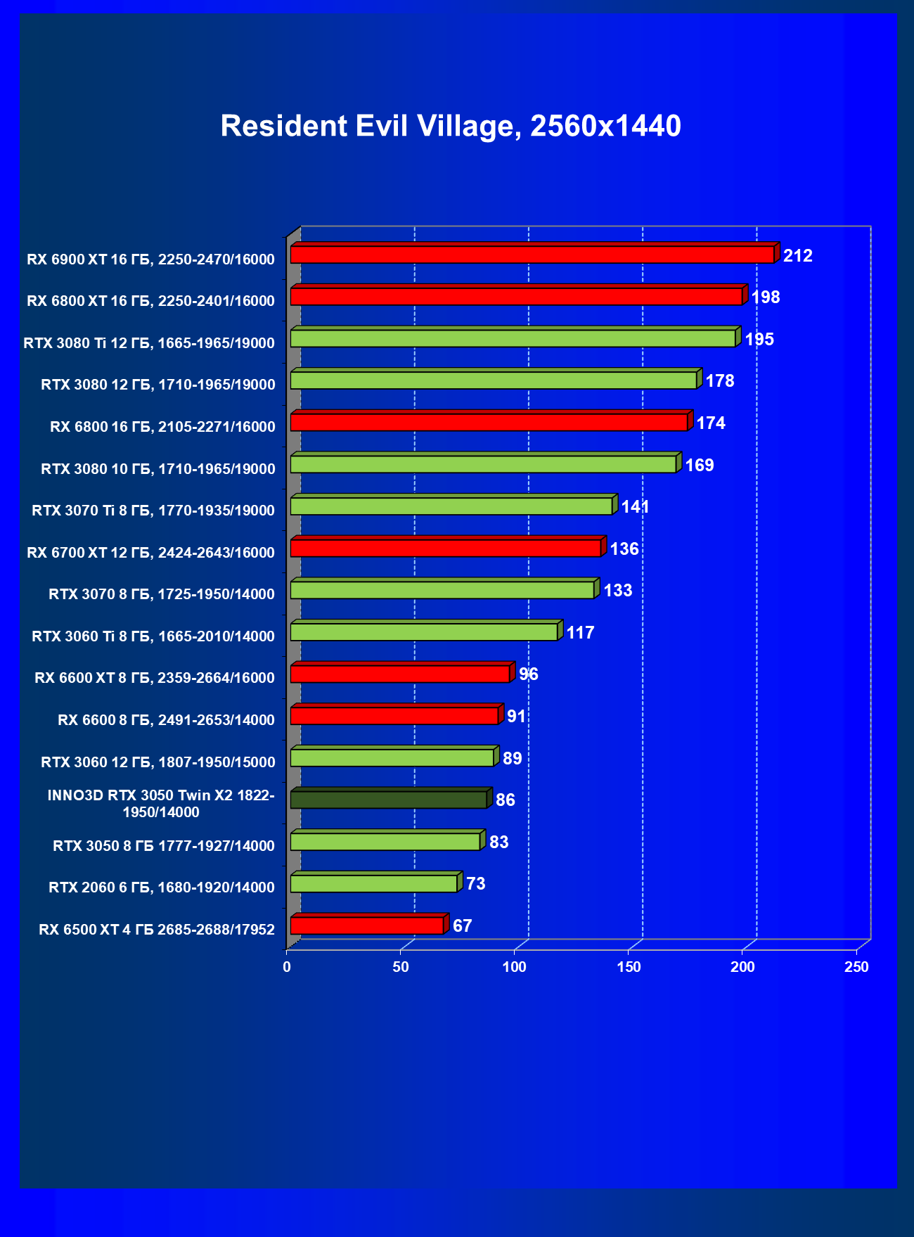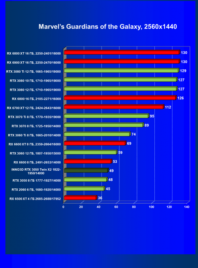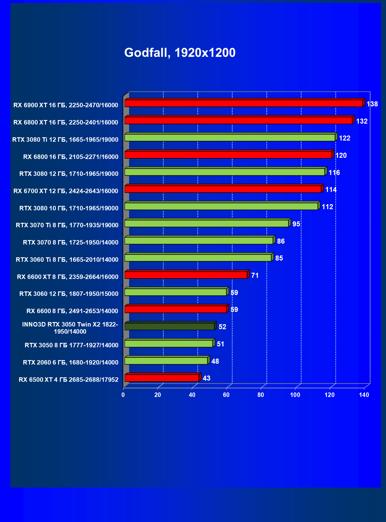 В данном случае RTX 3050 обошел не только более дорогой Radeon RX 6600, но и RX 6600 XT: даже поддержка FSR в ряде игр не помогает последнему поколению Radeon компенсировать сильное падение производительности от включения трассировки лучей. Учитывая чуть более высокие частоты работы карты Inno3D, логично смотрится лидерство этого продукта в своей группе.